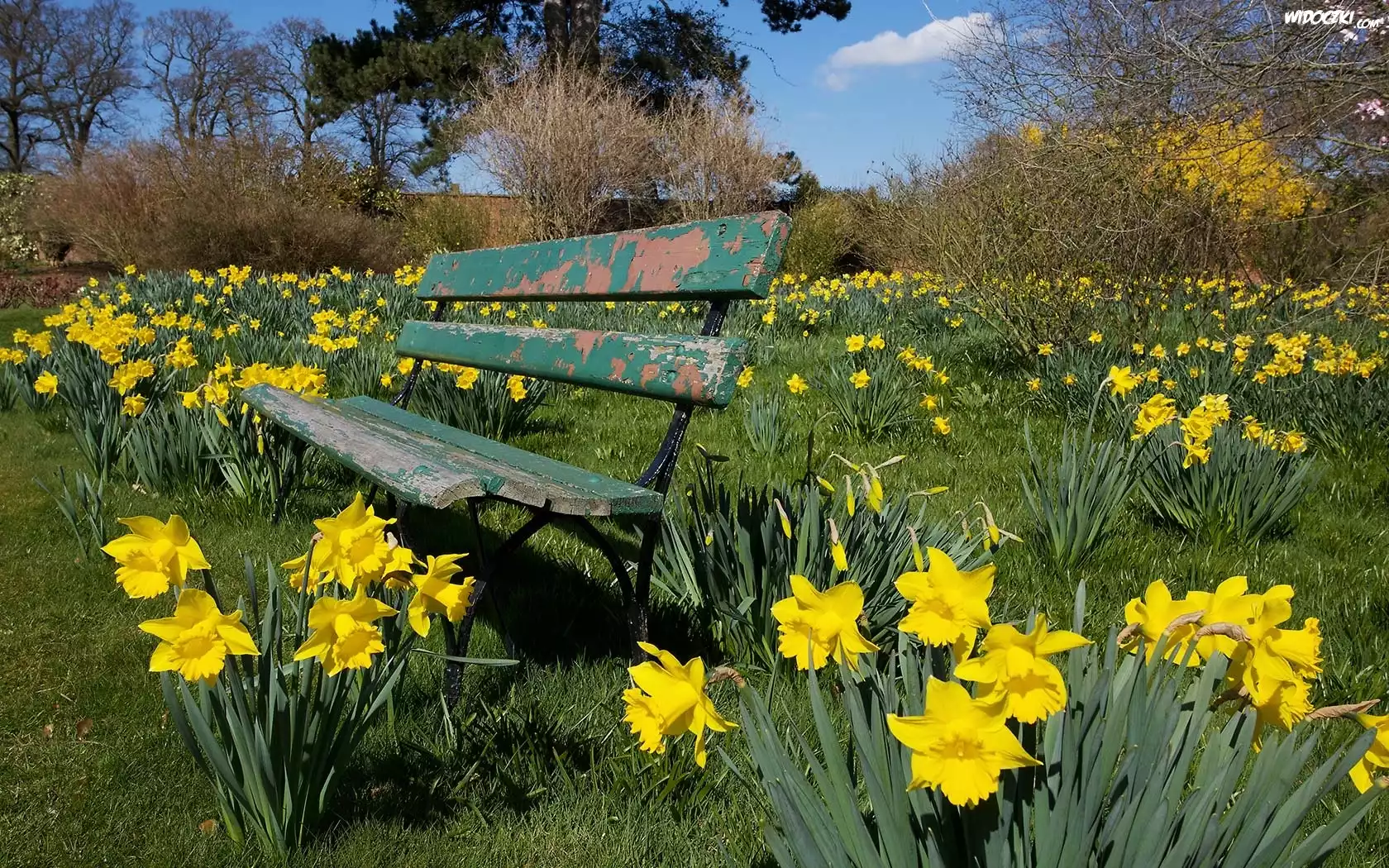 Zdjęcia, Żonkile, Ogród, Ławeczka