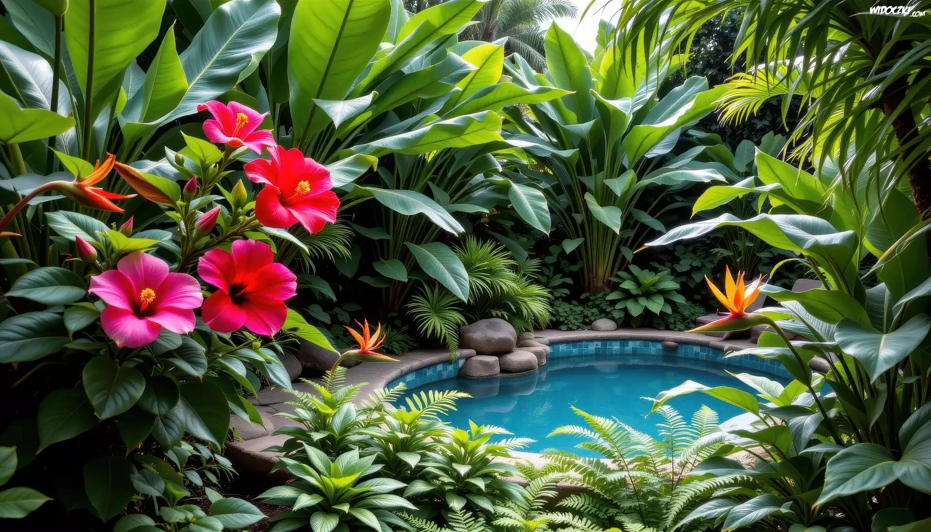 Ogród, Oczko wodne, Kwiaty, Czerwone, Strelicje, Paprocie, Liście, AI