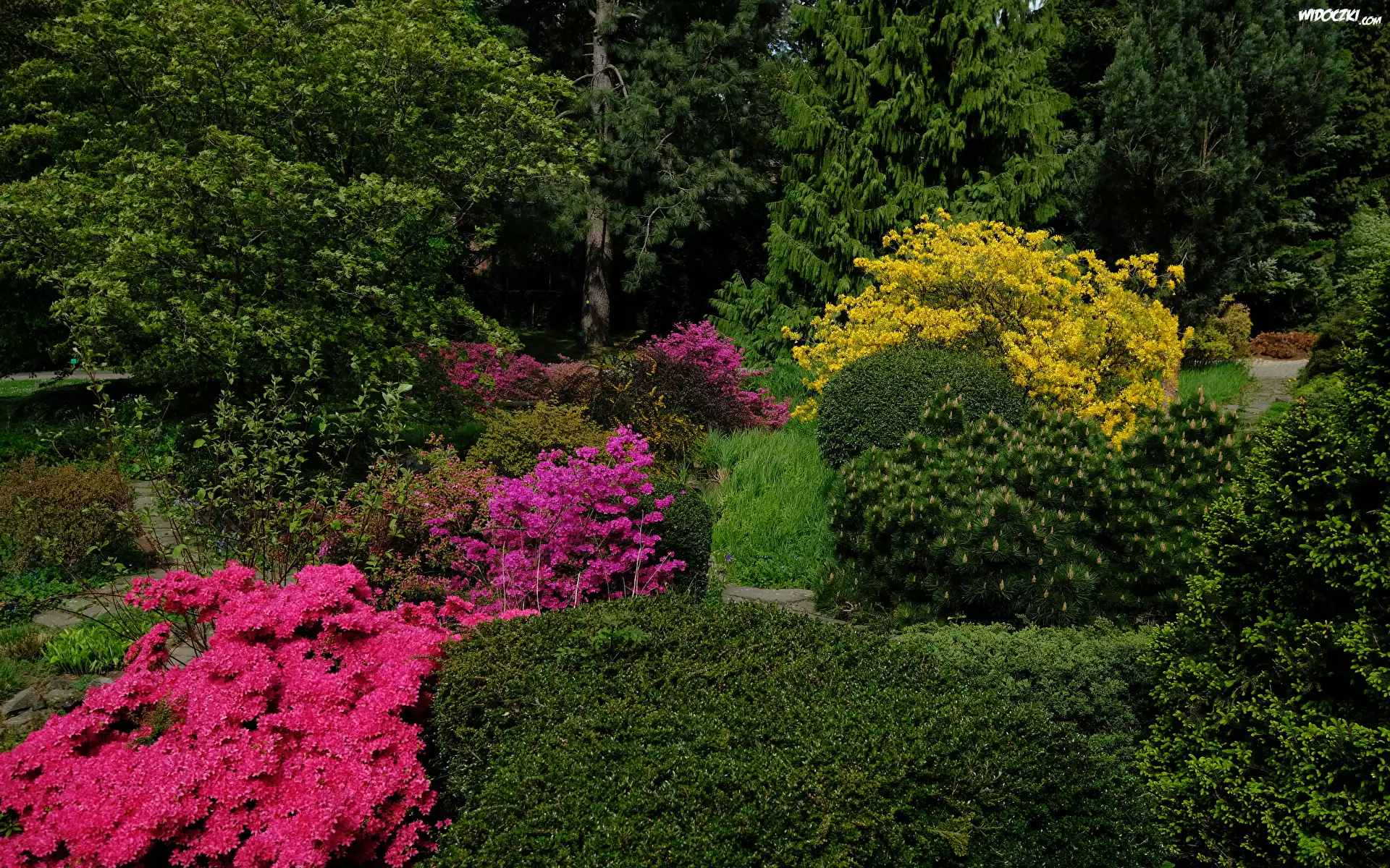 Zdjęcia, Ogród, Park, Krzewy, Rododendrony, Drzewa