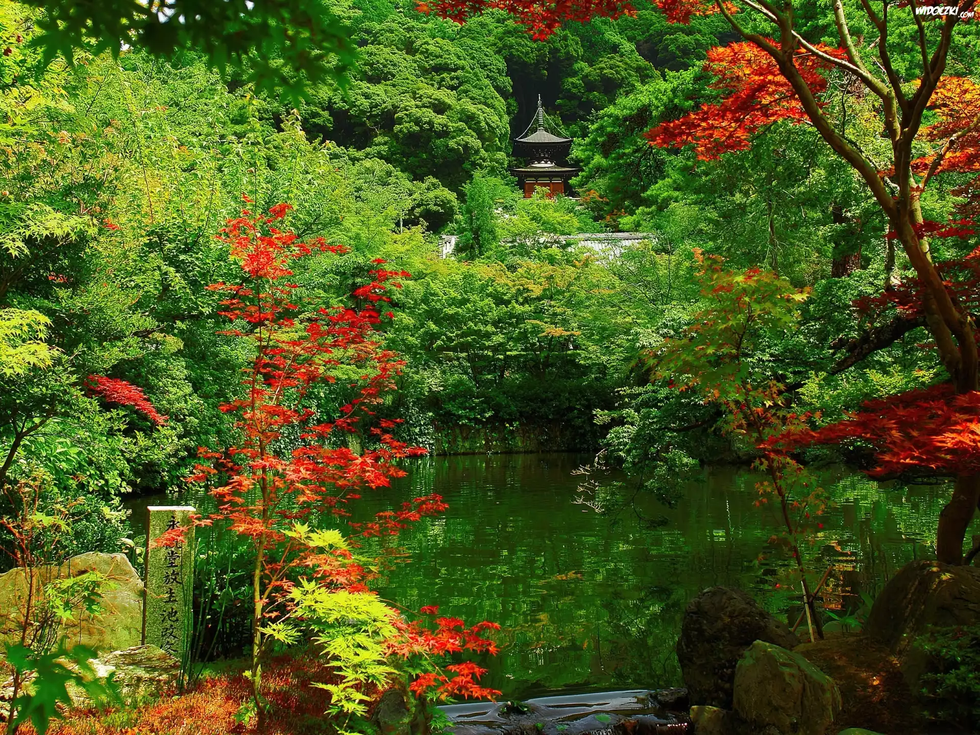 Zdjęcia, Ogród, Japoński, Roślinność, Sadzawka
