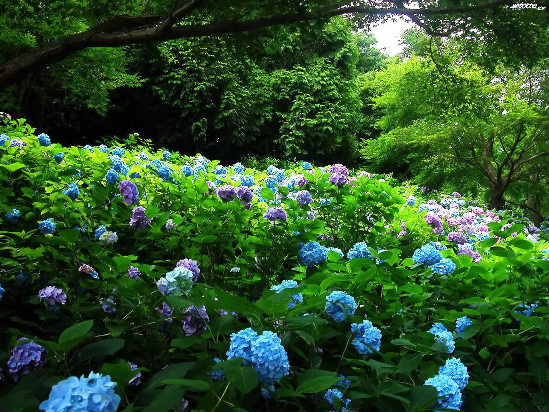 Ogród, Hortensja, Niebieska, Różowa, Drzewa