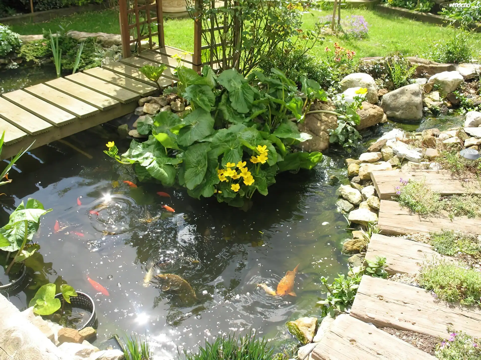 Zdjęcia, Ogród, Oczko, Wodne, Ryby, Kwiaty