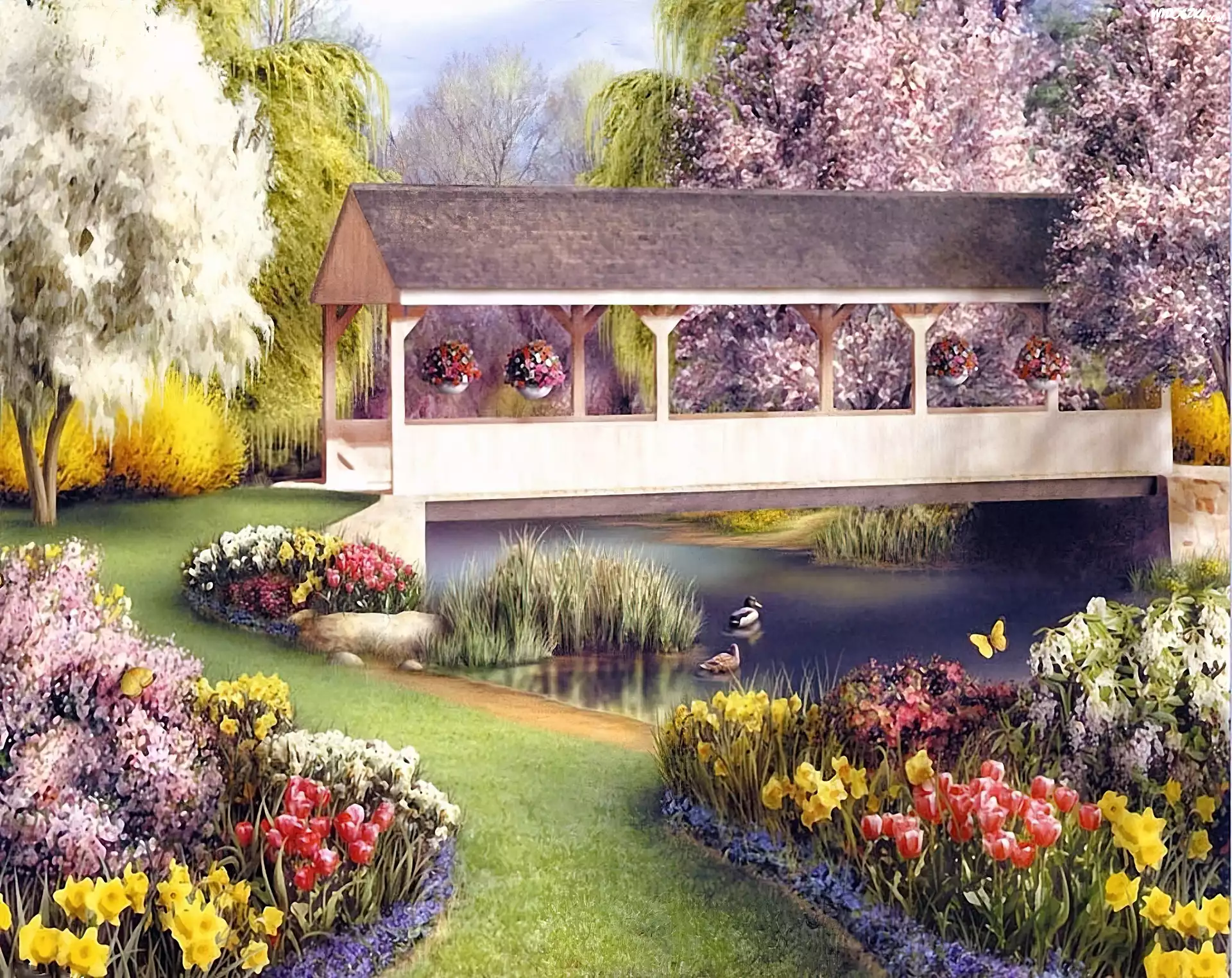 Ogród, Kryty, Most, Rzeka, Kwiaty