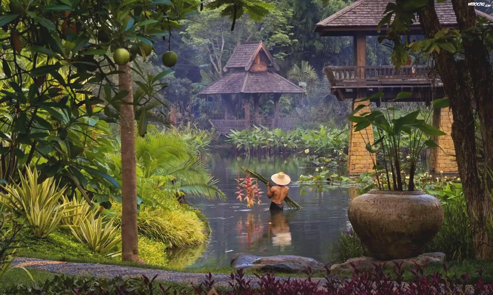 Zdjęcia, Ogród, Altana, Drzewa, Kwiaty, Staw, Mężczyzna