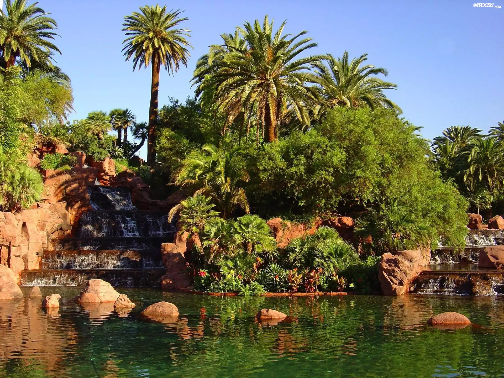Ogród, Kaskady, Staw, Palmy