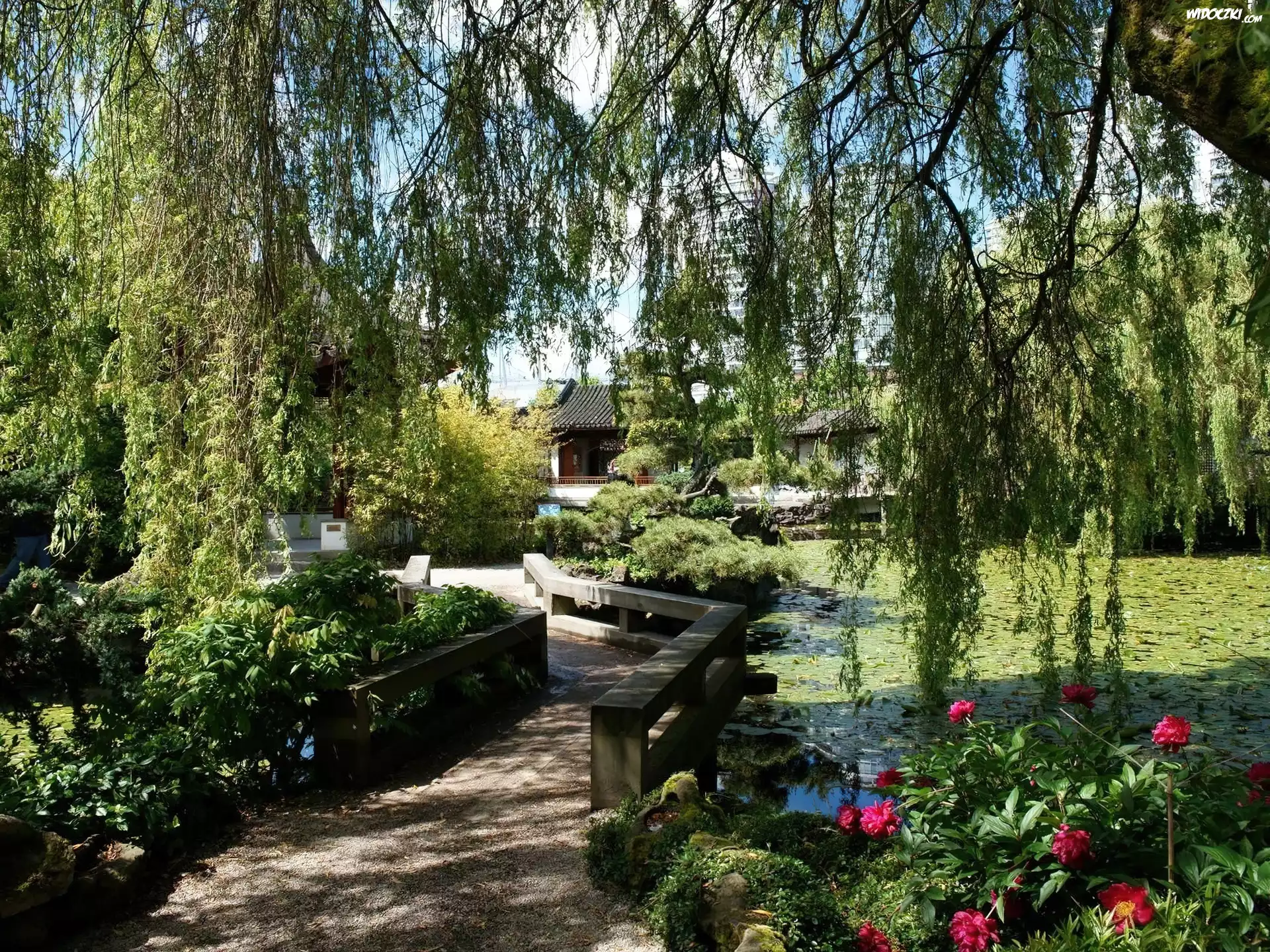 Zdjęcia, Ogród, Mostek, Staw, Wierzba