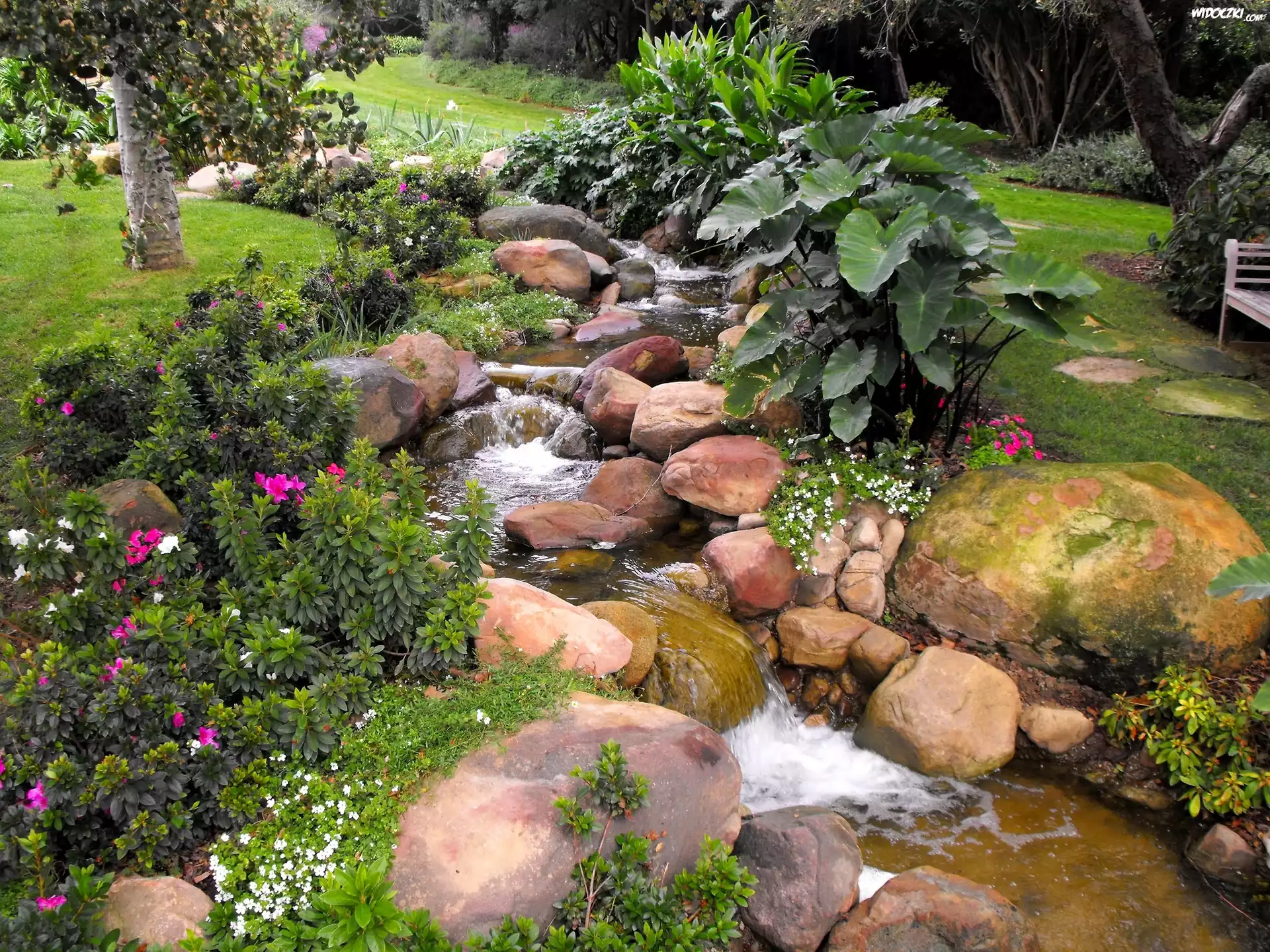 Zdjęcia, Ogród, Kamienie, Strumyk, Zieleń