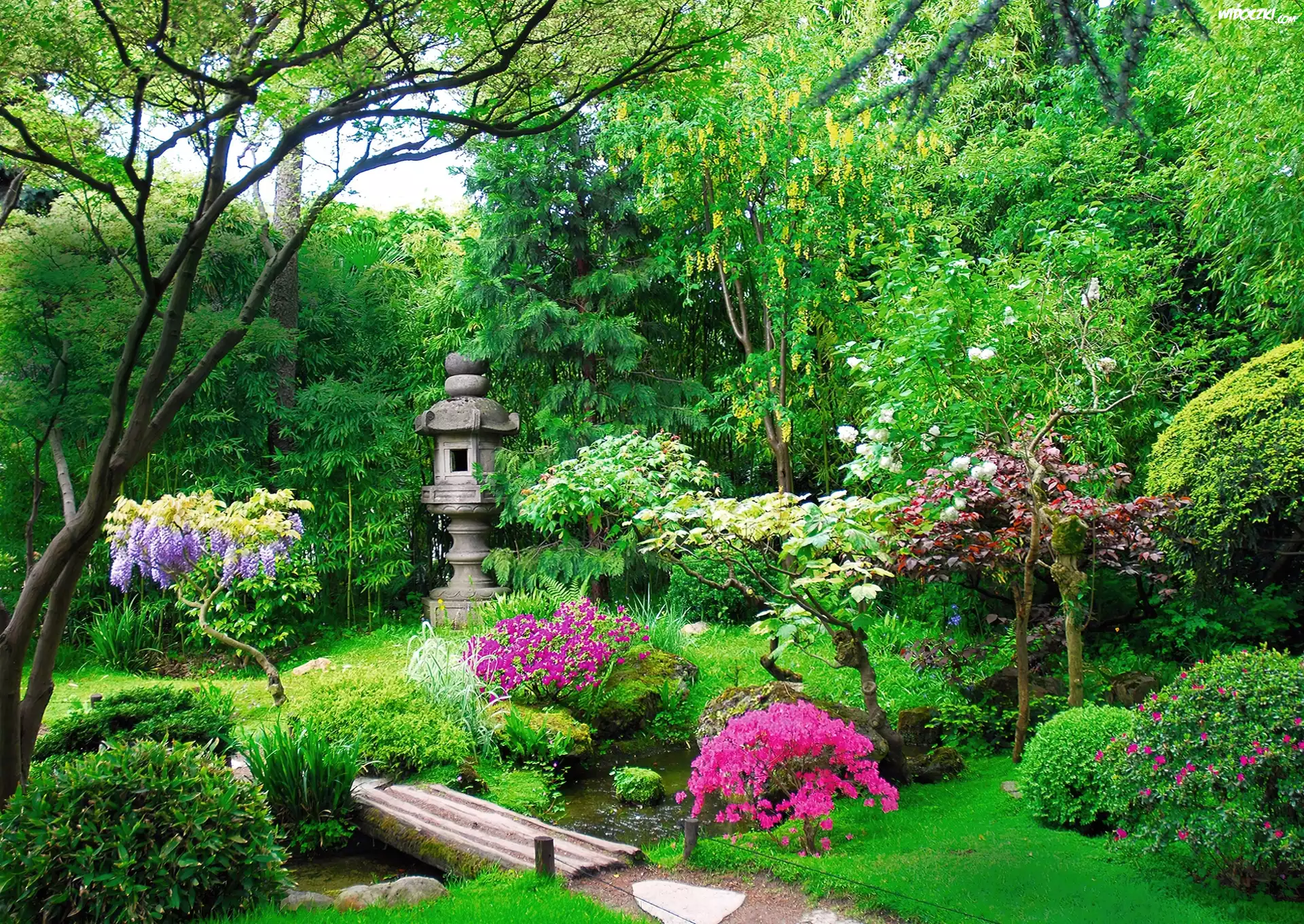 Ogród, Japoński, Mostek, Strumyk, Kolumienka