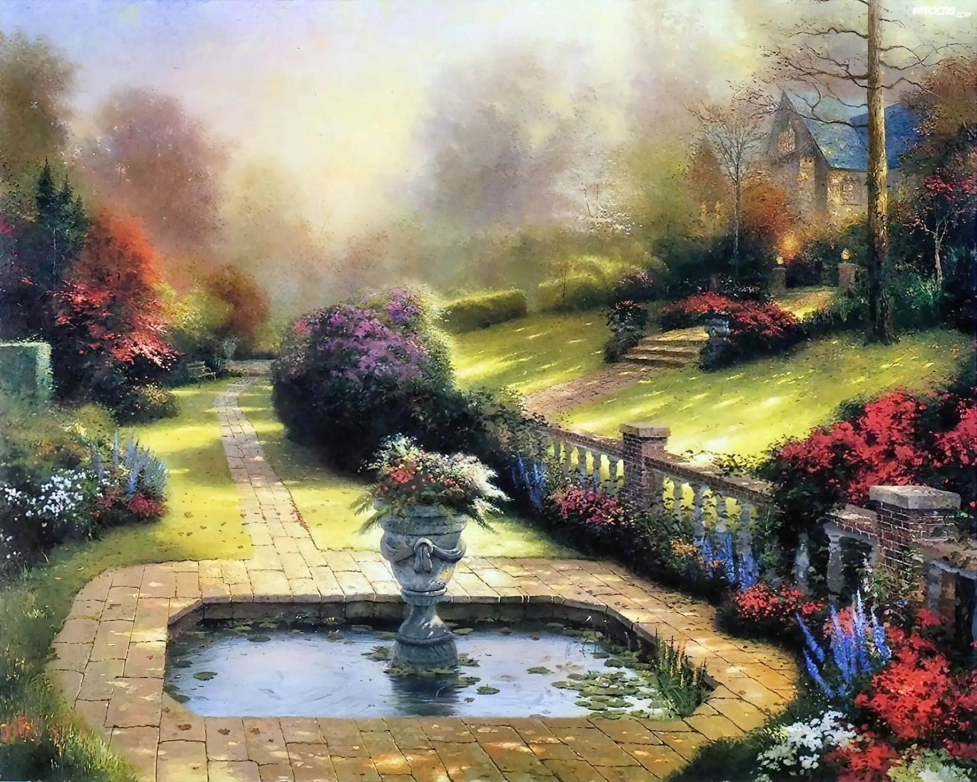 Zdjęcia, Ogród, Kwiaty, Oczko, Wodne, Thomas Kinkade