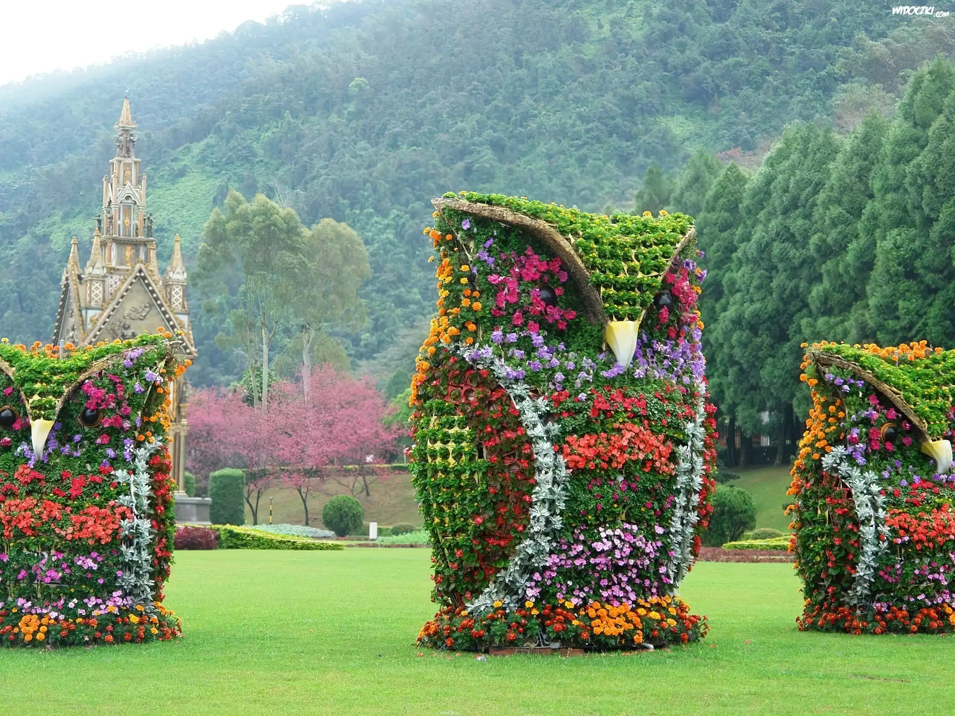 Zdjęcia, Ogród, Dekoracja, Kwiatowa, Trzy, Sowy