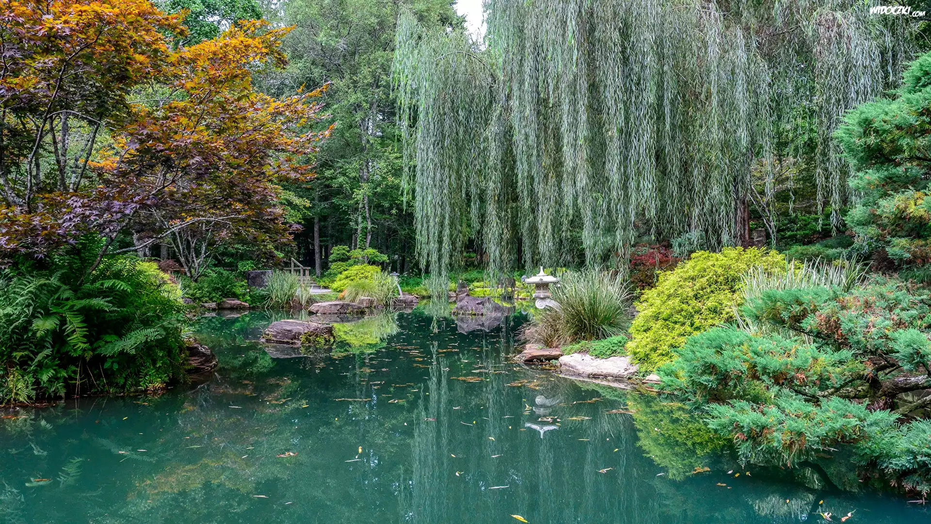 Zdjęcia, Ogród, Staw, Drzewa, Wierzba, Krzewy
