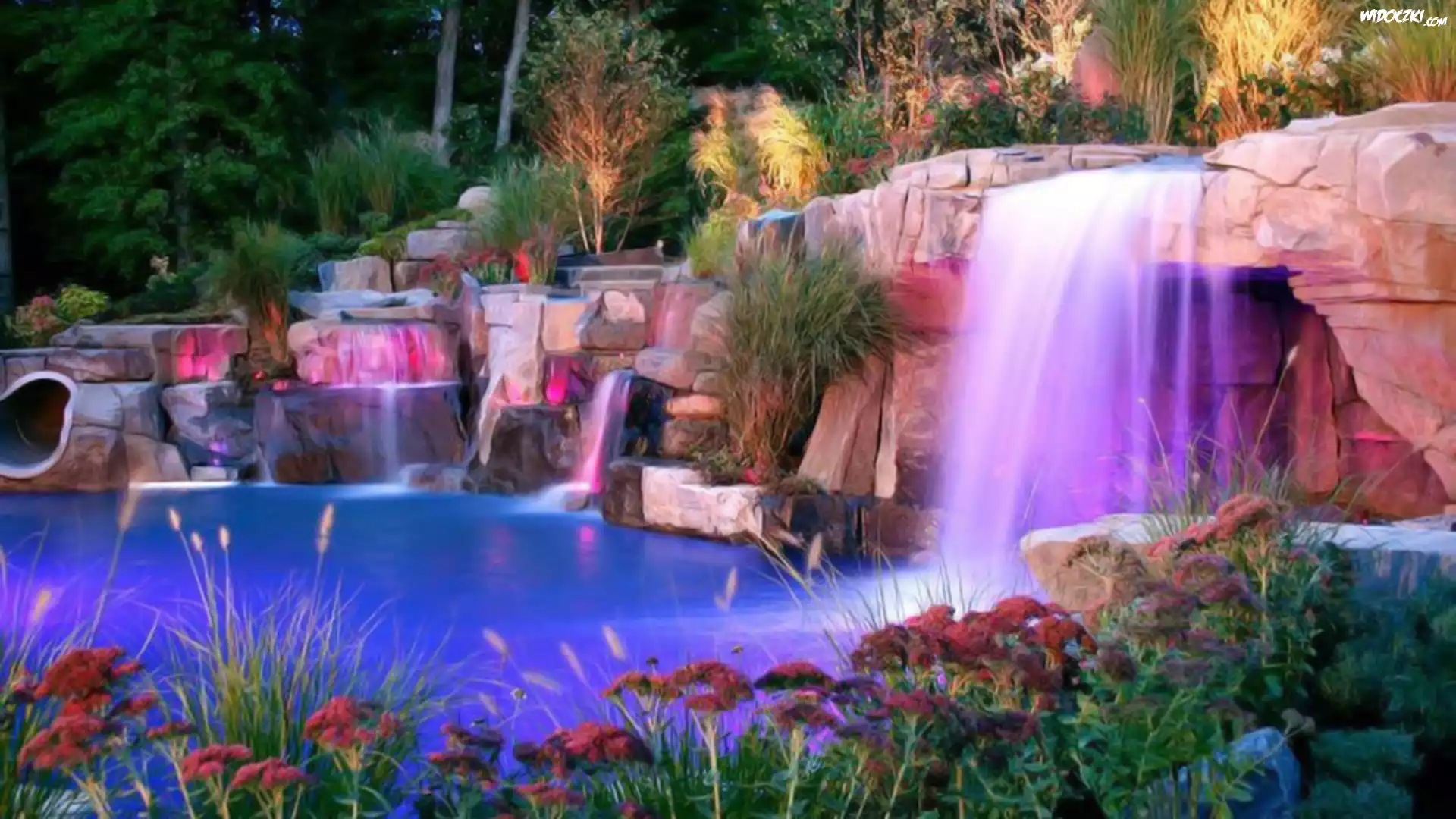 Zdjęcia, Ogród, Rośliny, Wodospad, Kamienie