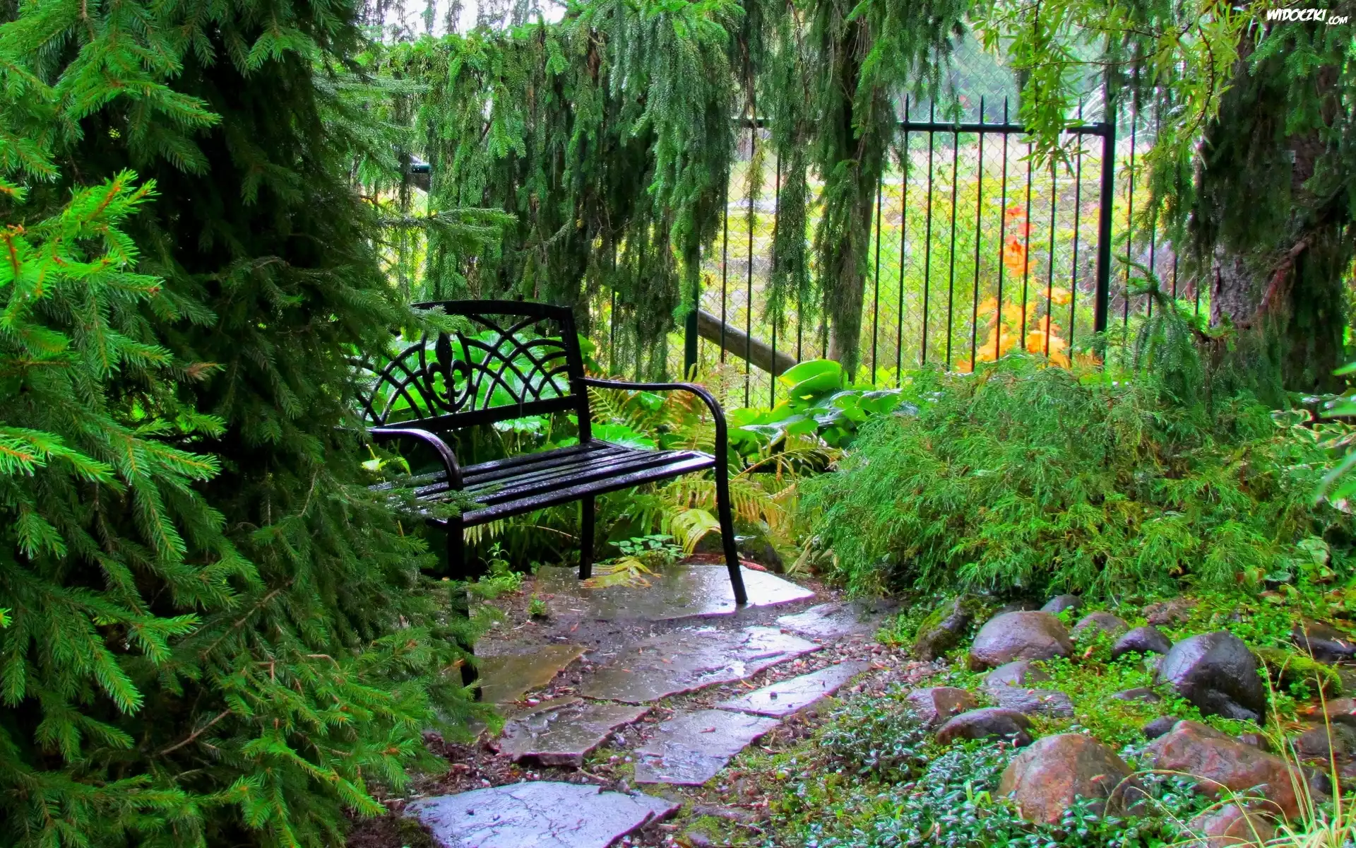 Zdjęcia, Ogródek, Świerki, Kamienie, Ławka, Płot
