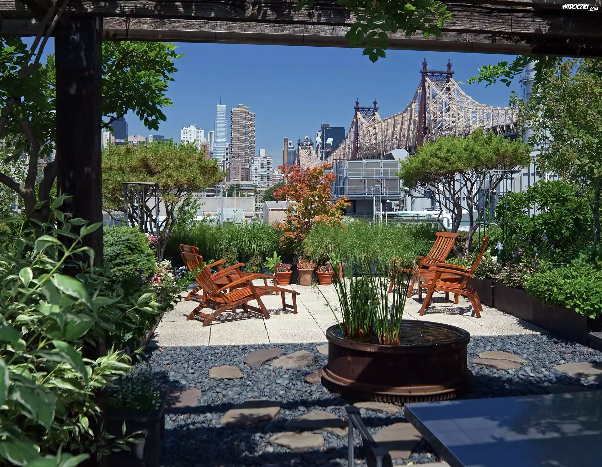 Zdjęcia, Ogródek, Drapacze, Chmur, Most