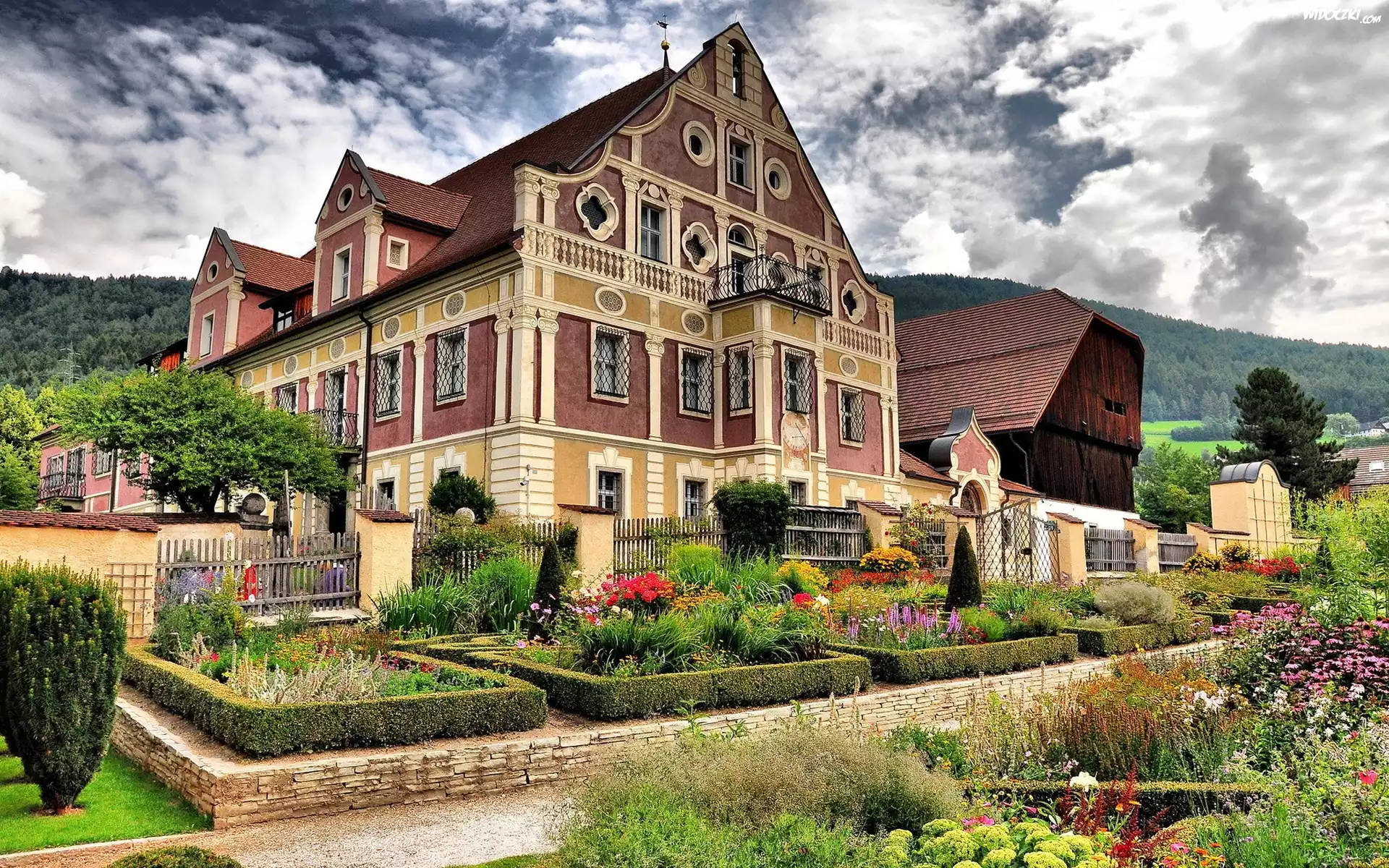 Zdjęcia, Ładny, Dom, Kwiecisty, Ogródek, Niebo