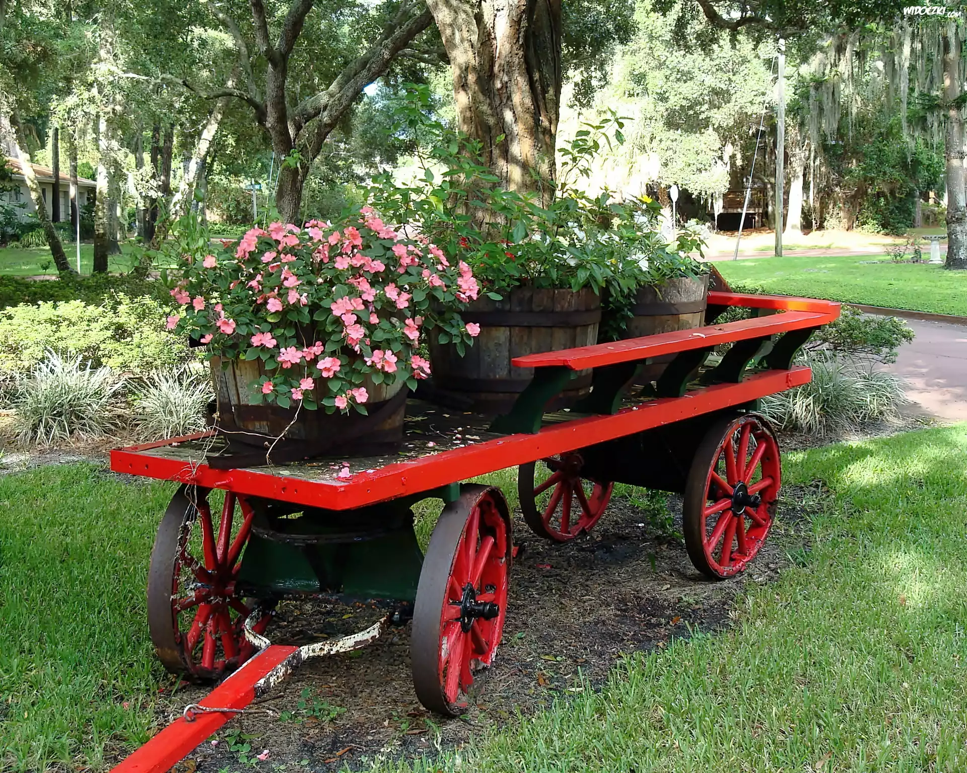 Zdjęcia, Ogródek, Czerwony, Wózek, Donice, Kwiatów