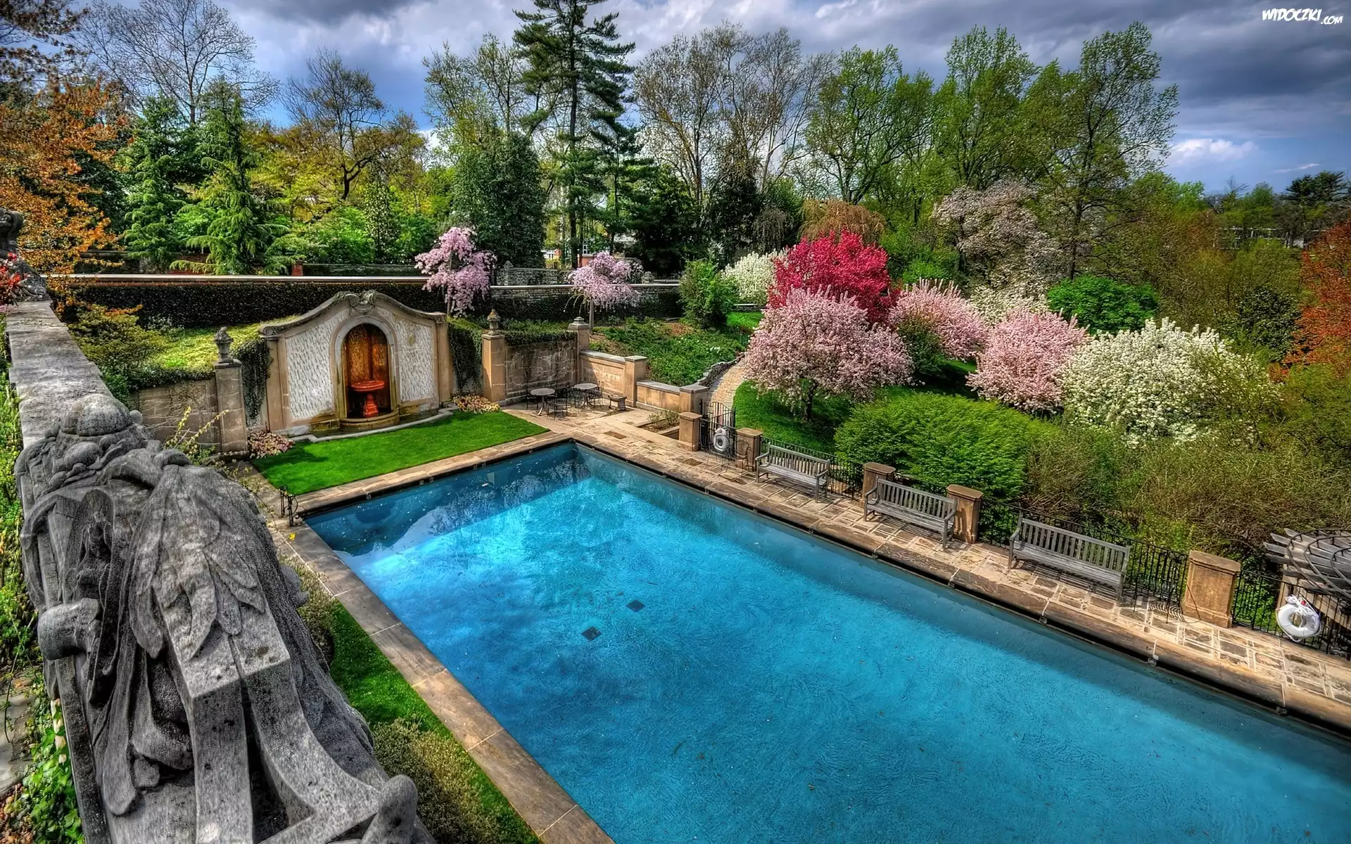 Zdjęcia, Ogrody, Kwitnące, Drzewa, Basen