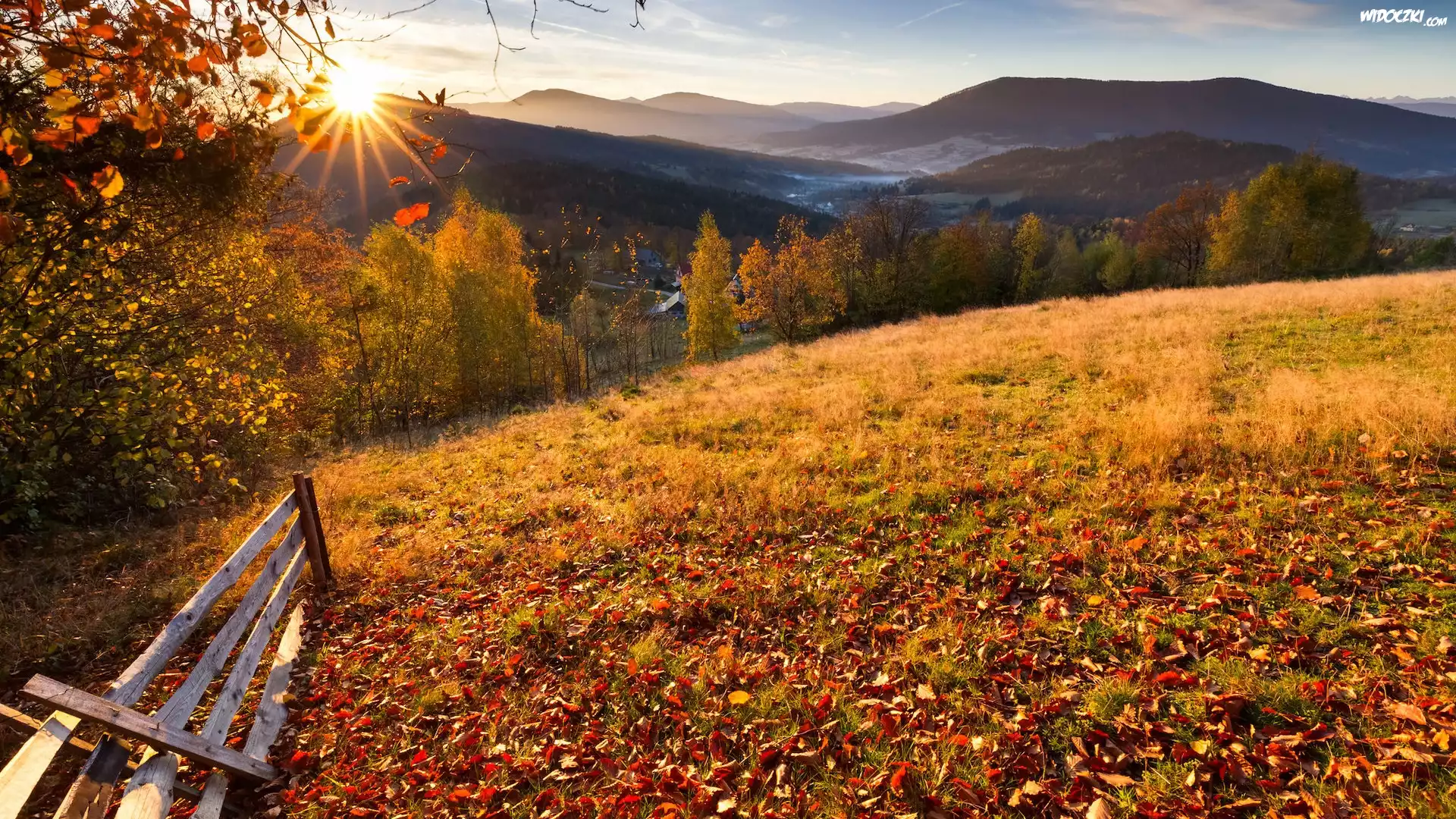 Zdjęcia, Polska, Góry, Beskidy, Wschód słońca, Jesień, Drzewa, Ogrodzenie