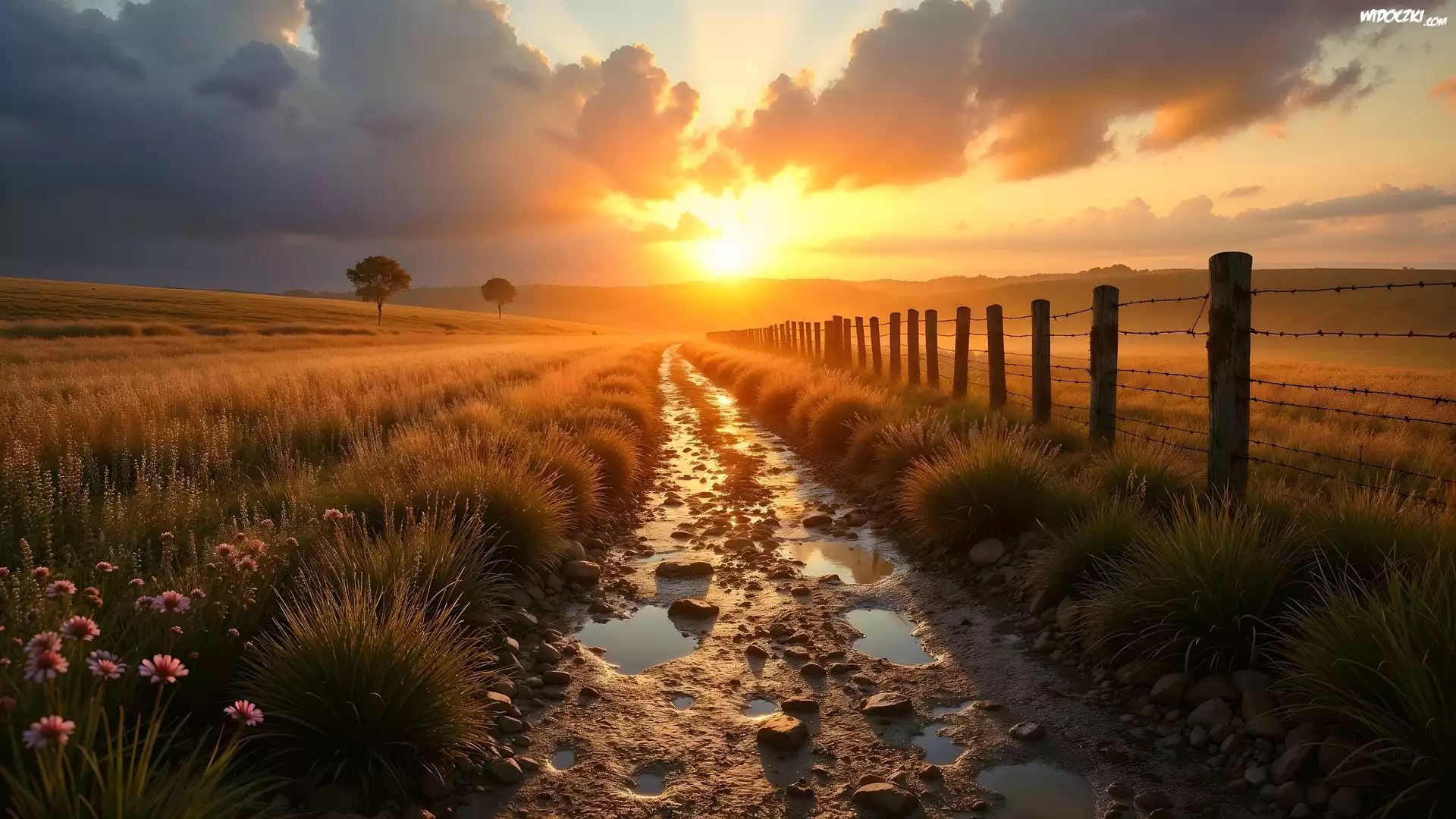 Zdjęcia, Łąka, Pole, Droga, Ogrodzenie, Kałuże, Zachód słońca