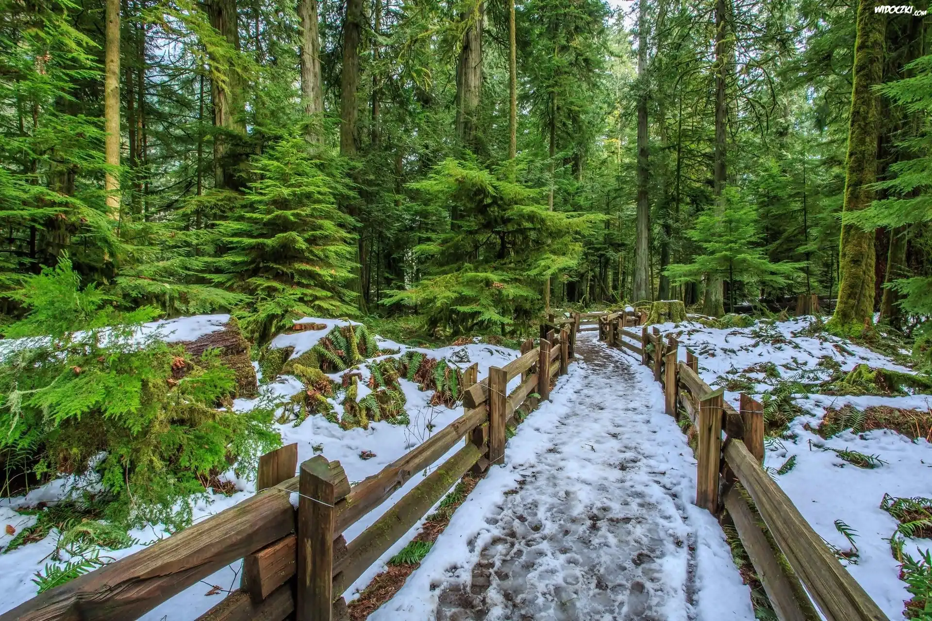 Zdjęcia, Ogrodzenie, Droga, Las, Drzewa, Śnieg
