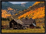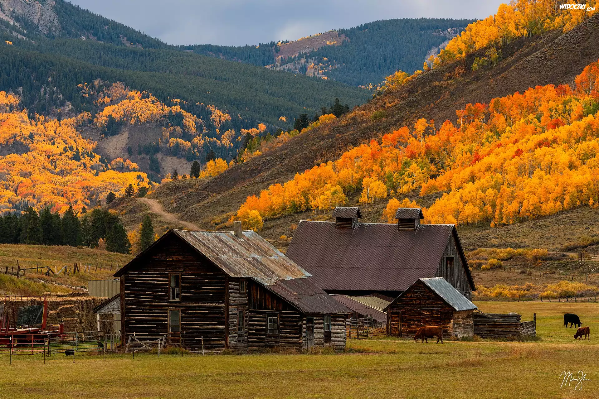 Jesień, Góry, Lasy, Pożółkłe, Drzewa, Dom, Stodoła, Ogrodzenie, Łąki, Krowy, Hrabstwo Gunnison, Kolorado, Stany Zjednoczone |