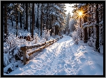 Zima, Las, Śnieg, Ośnieżona, Droga, Promienie słońca, Ogrodzenie
