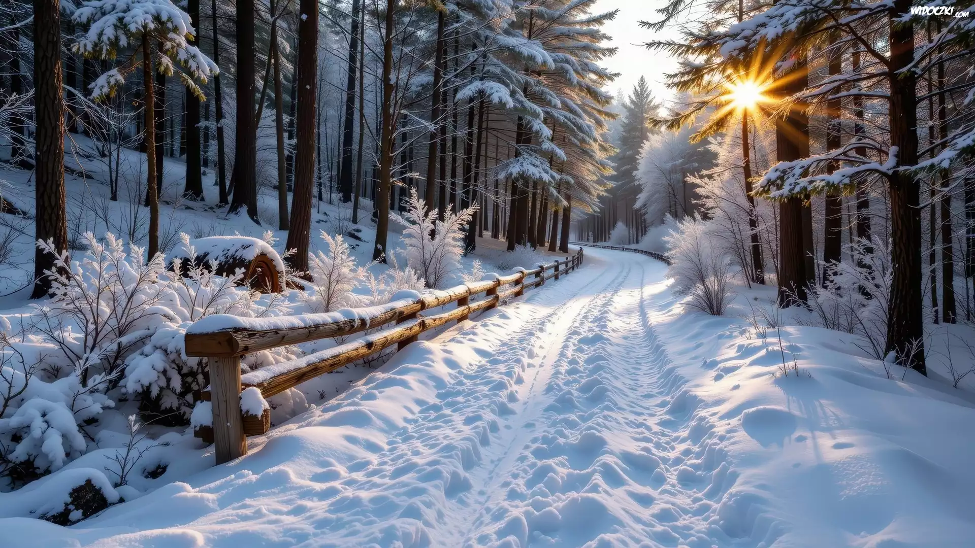 Zdjęcia, Zima, Las, Śnieg, Ośnieżona, Droga, Promienie słońca, Ogrodzenie