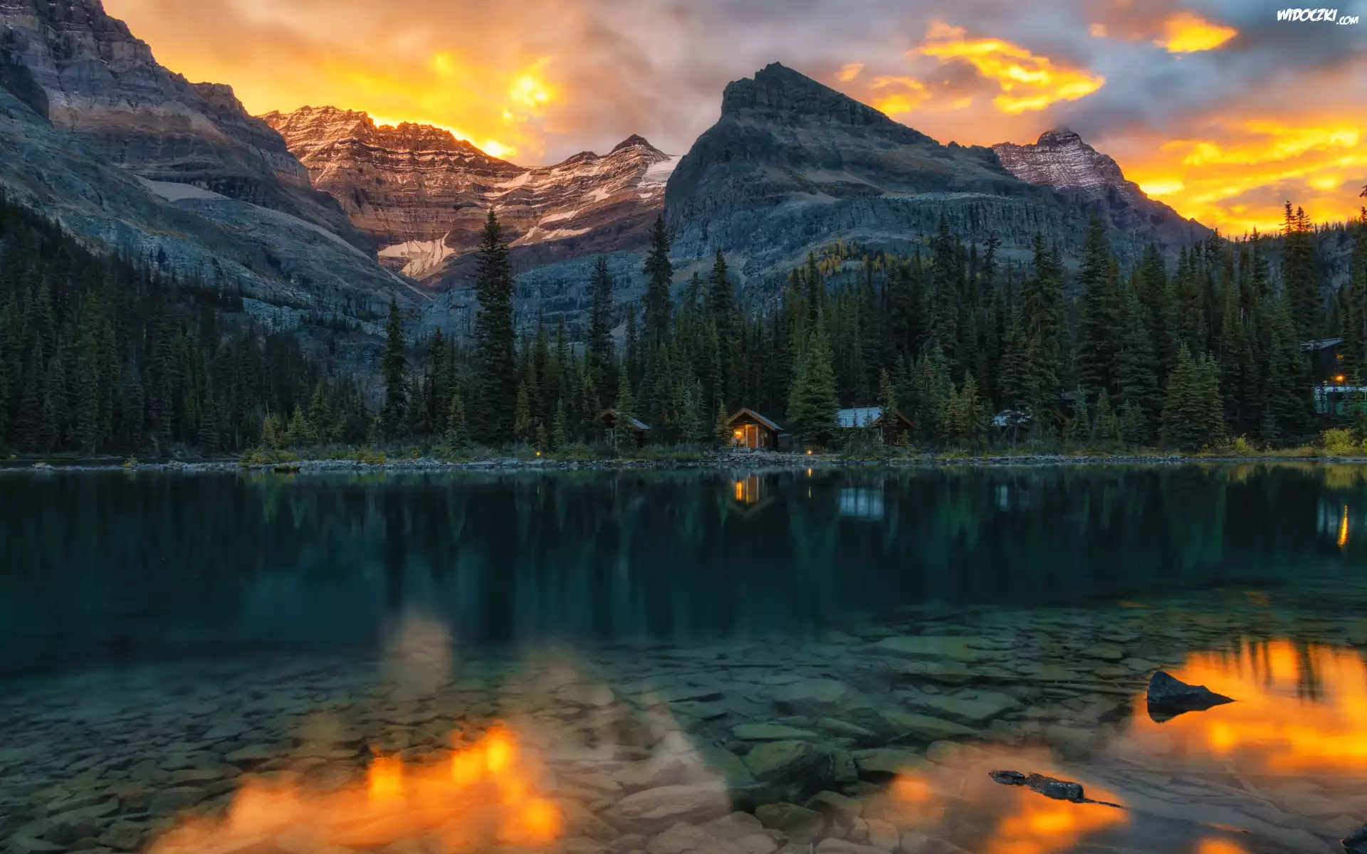 Góry, Canadian Rocky Mountains, Jezioro, Lake OHara, Park Narodowy Yoho, Domy, Las, Drzewa, Niebo, Chmury, Odbicie, Zachód Słońca, Alberta, Kanada |