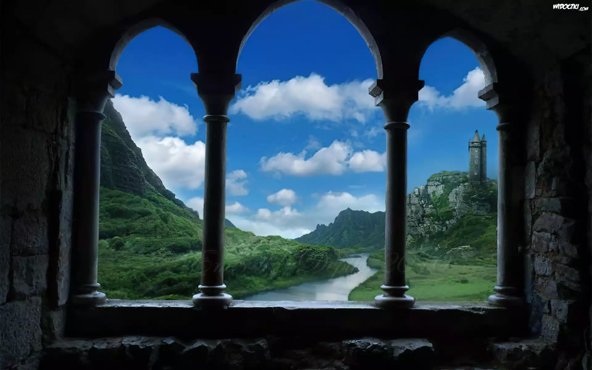 Okno, Zamek, Wzgórze, Rzeka, Chmury