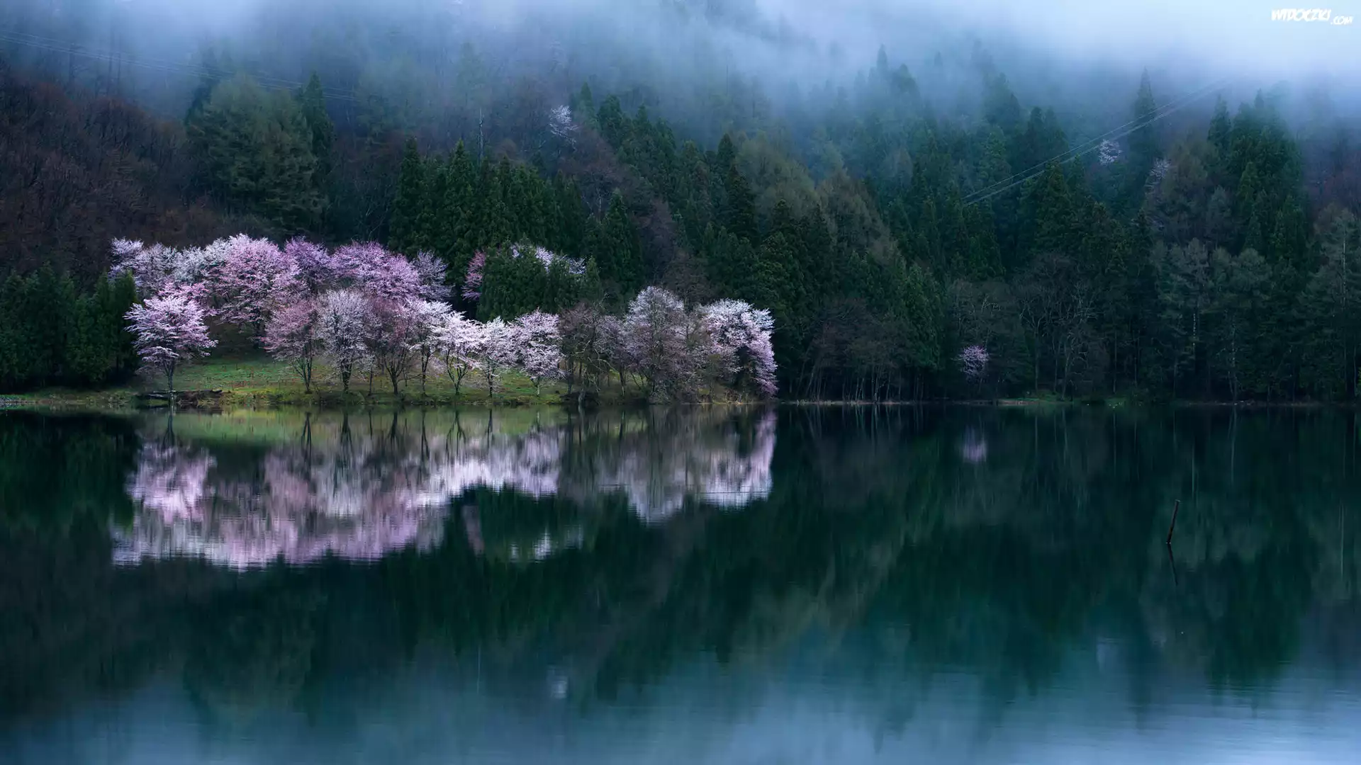 Zdjęcia, Okwiecone, Drzewa, Jezioro