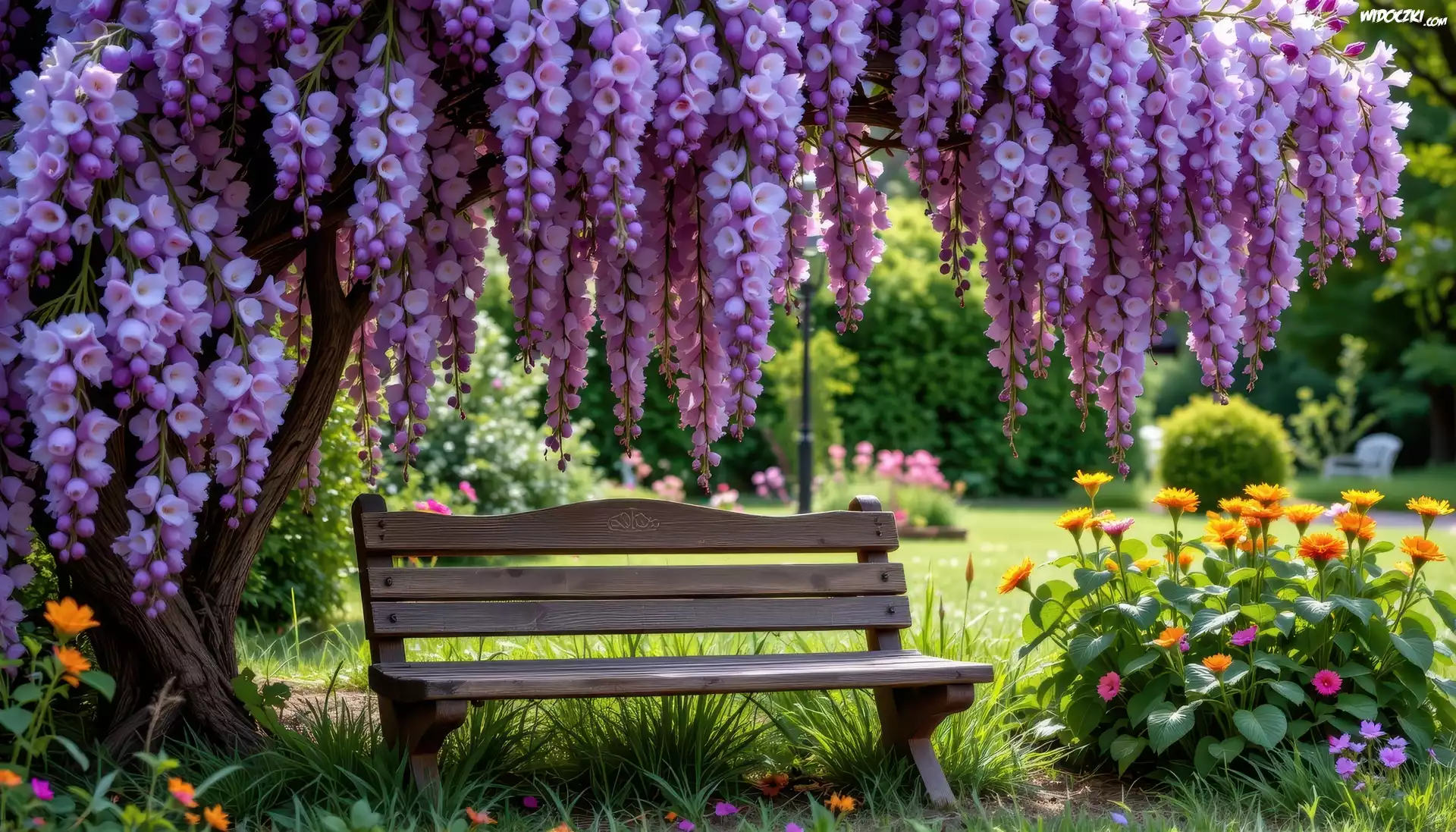 Zdjęcia, Fioletowe, Kwiaty, Ławka, Okwiecone, Drzewo, Grafika AI