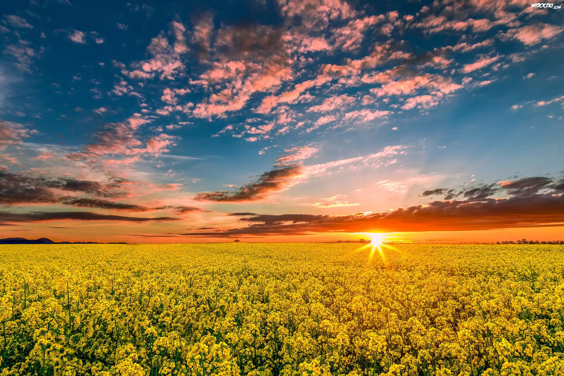 Pole, Żółte, Kwiatki, Kolorowe, Niebo, Zachód, Słońca