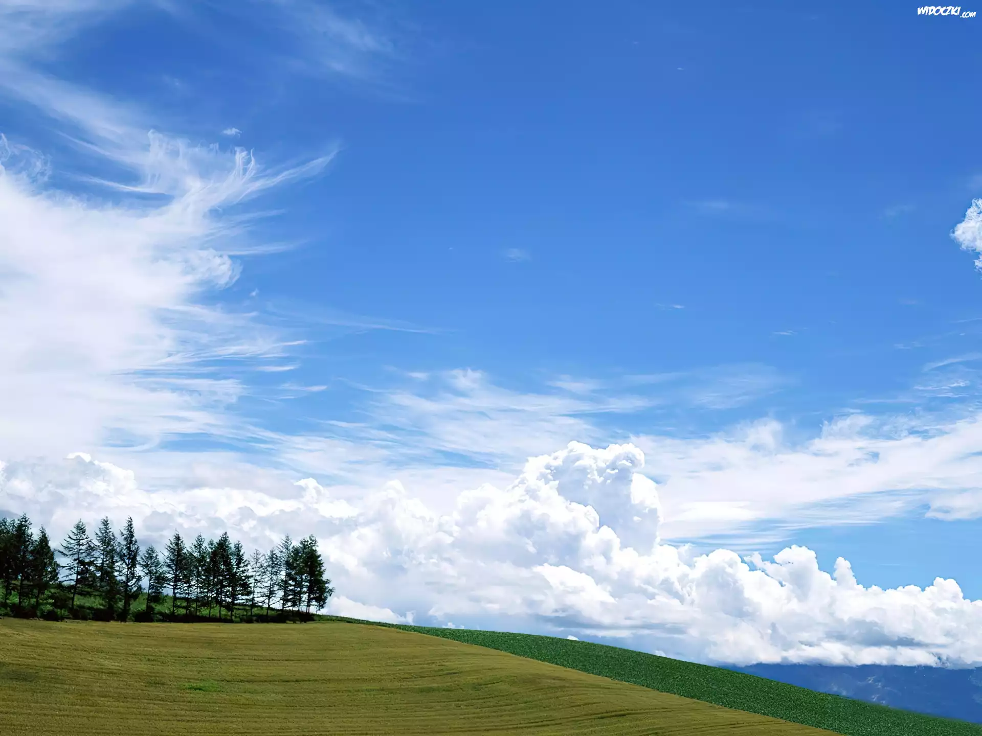 Zdjęcia, Żółto, Zielone, Pole, Drzewka, Błękitne, Niebo