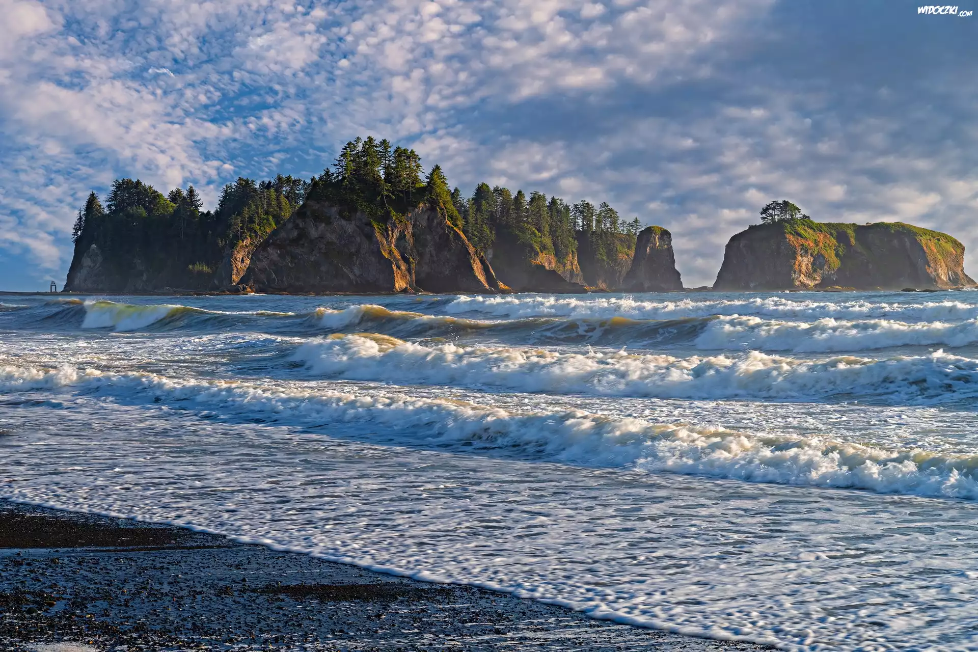 Stany Zjednoczone, Waszyngton, Park Narodowy Olympic, Półwysep, Olympic Peninsula, Morze, Fale, Plaża Rialto, Skały, Drzewa |