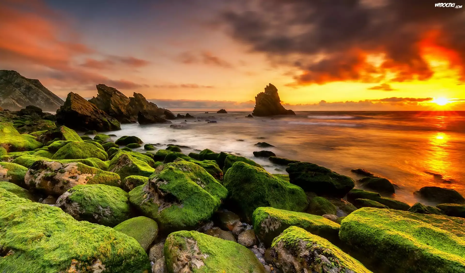 Zdjęcia, Wybrzeże, Omszałe, Kamienie, Skały, Morze, Zachód słońca