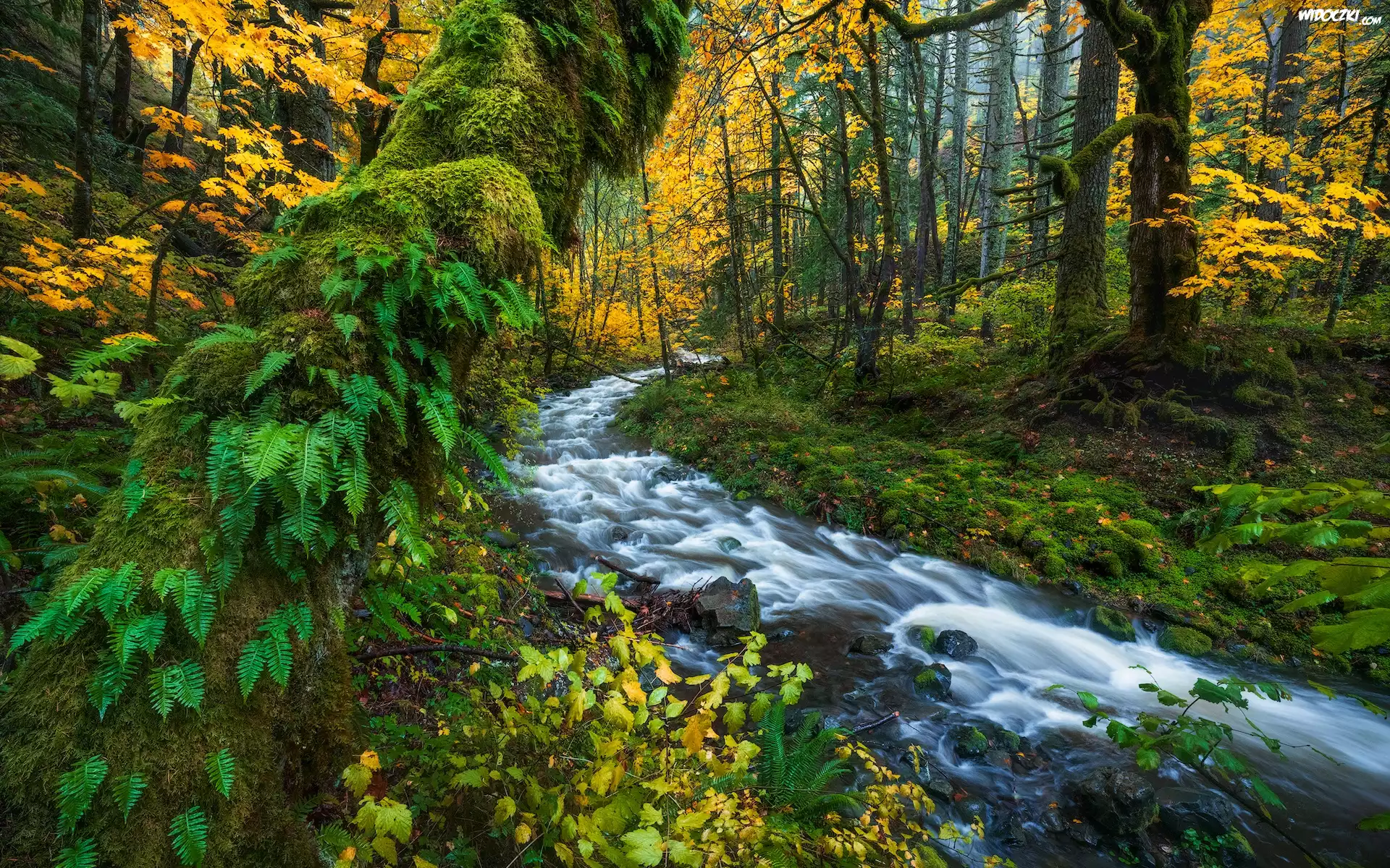 Zdjęcia, Las, Strumyk, Drzewa, Omszały, Pień, Paprocie, Jesień