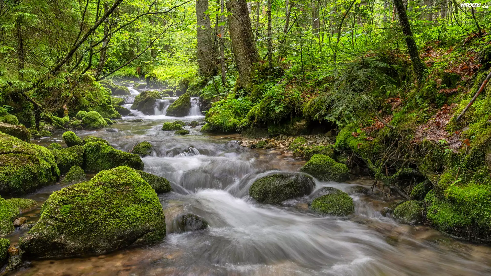 Zdjęcia, Las, Drzewa, Rzeka, Omszone, Kamienie, Rośliny
