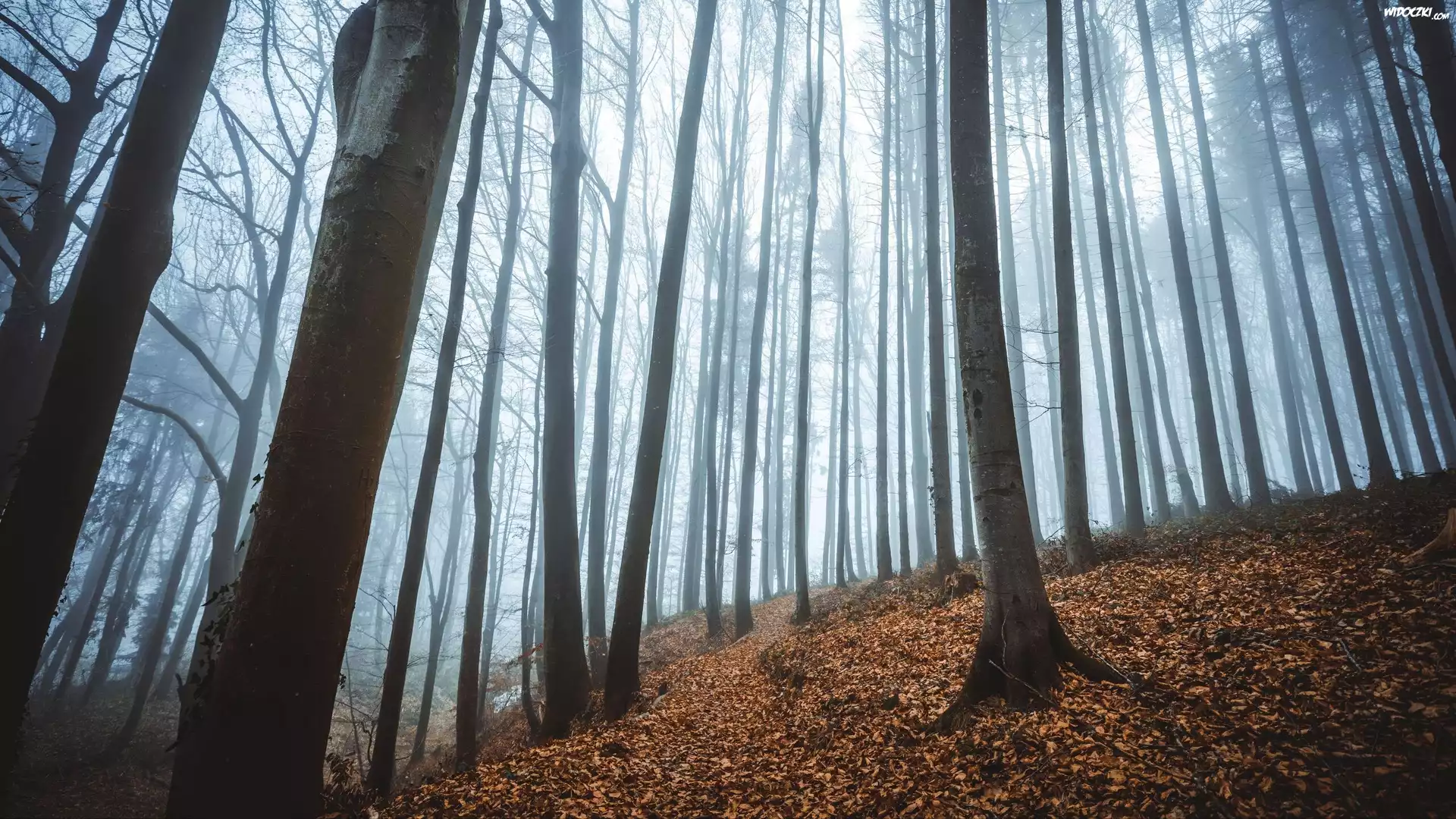 Zdjęcia, Las, Mgła, Jesień, Opadłe, Liście, Drzewa