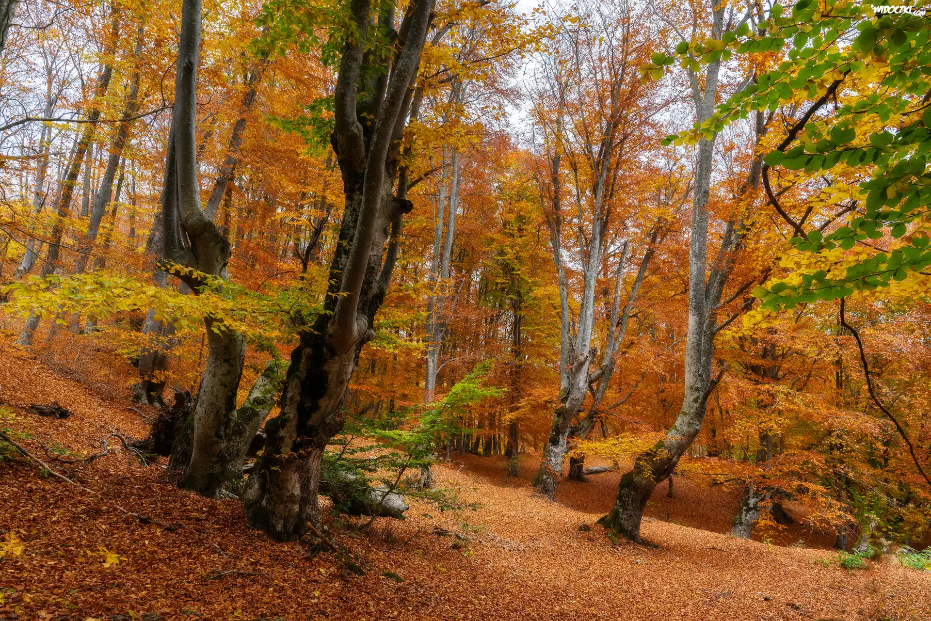 Zdjęcia, Jesień, Pożółkłe, Drzewa, Opadłe, Liście, Las
