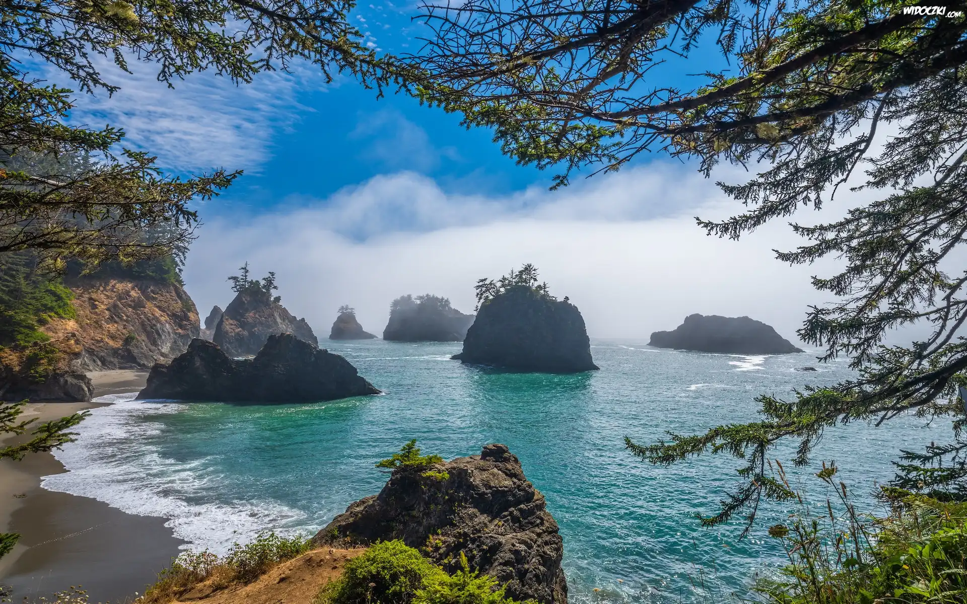 Stany Zjednoczone, Oregon, Plaża, Secret Beach, Morze, Skały, Drzewa, Gałęzie, Wybrzeże