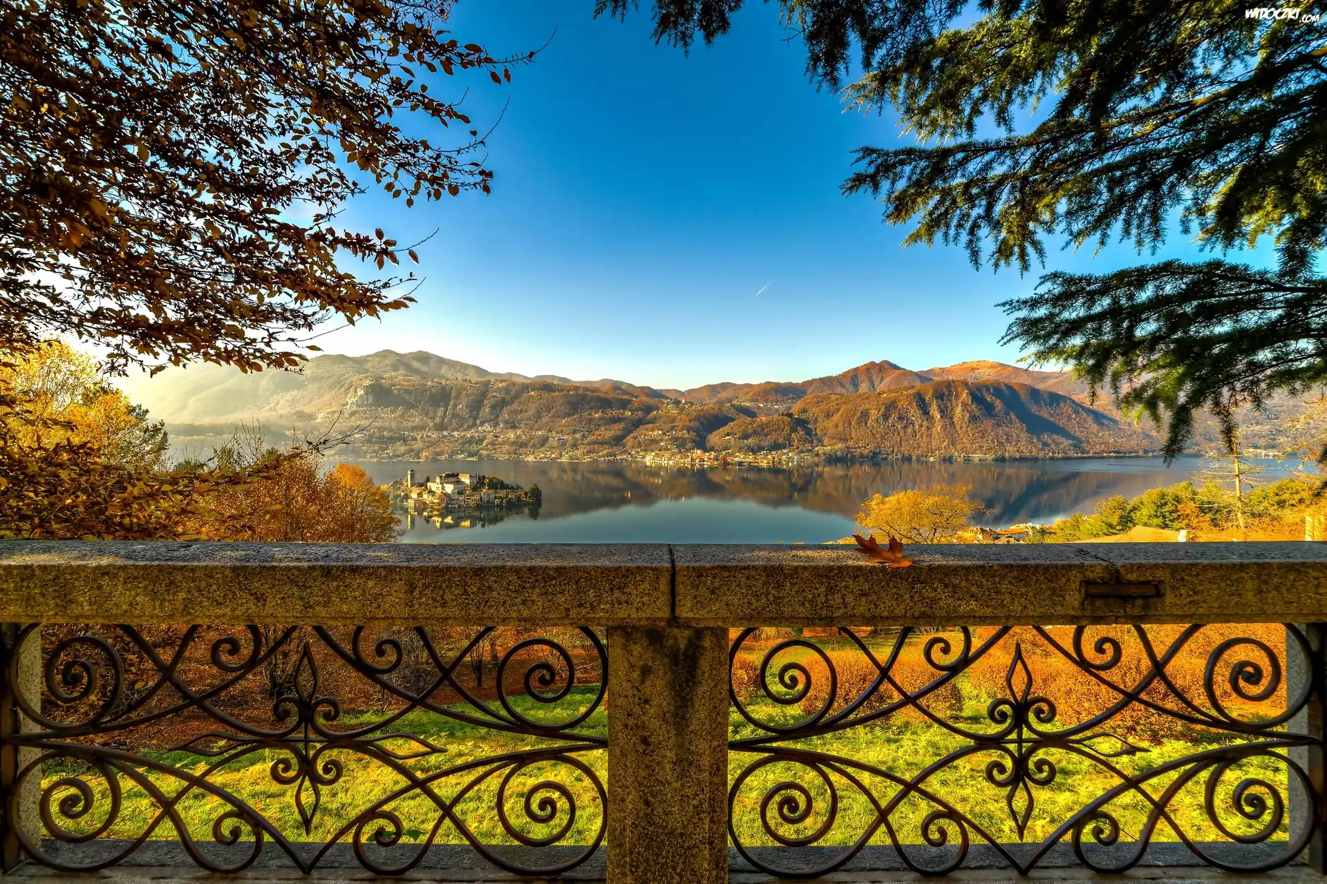 Jezioro Orta, Włochy, Góry, Jesień, Balustrada, Krajobraz