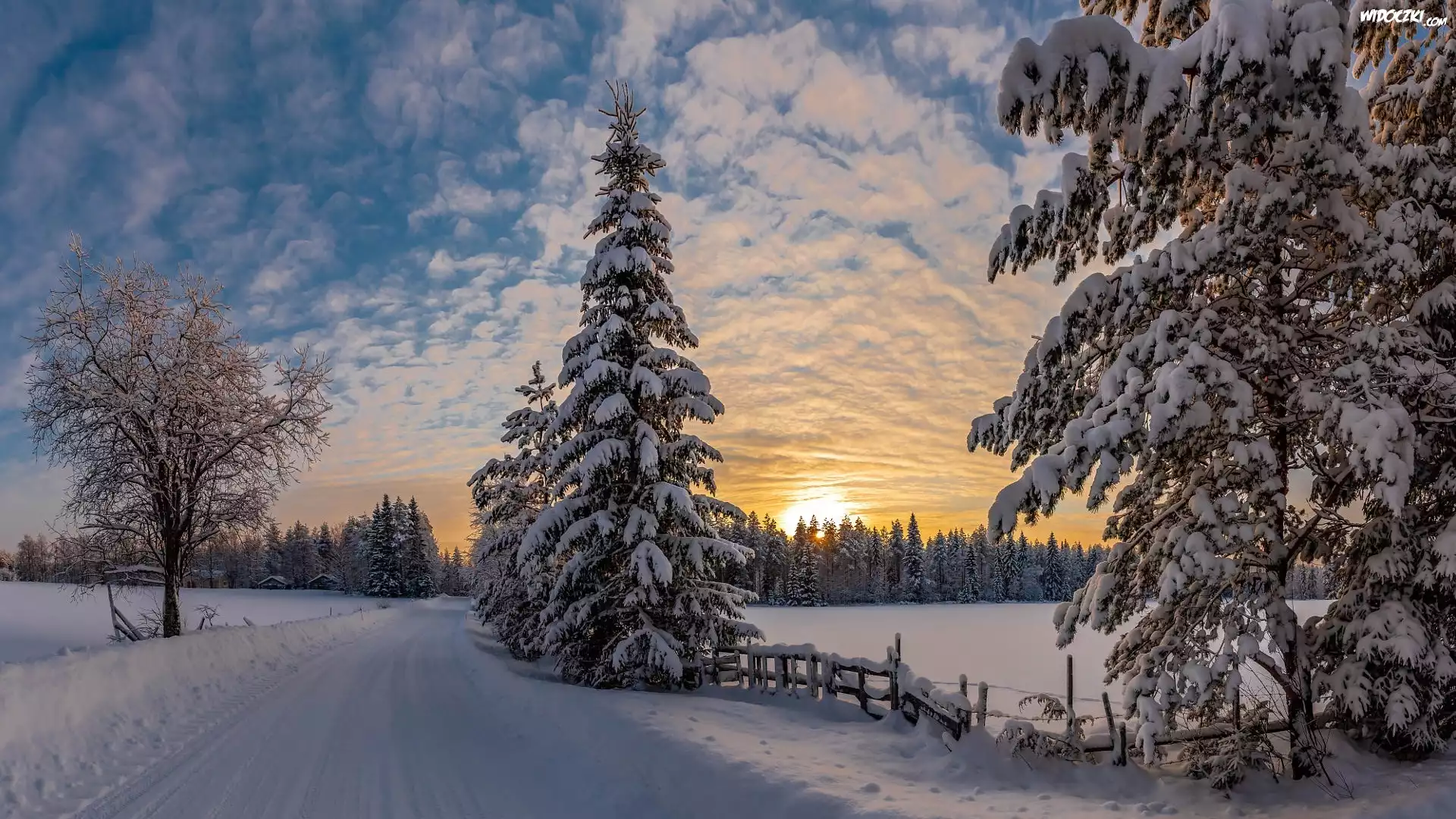 Zima, Wschód słońca, Ośnieżona, Droga, Ośnieżone, Drzewa