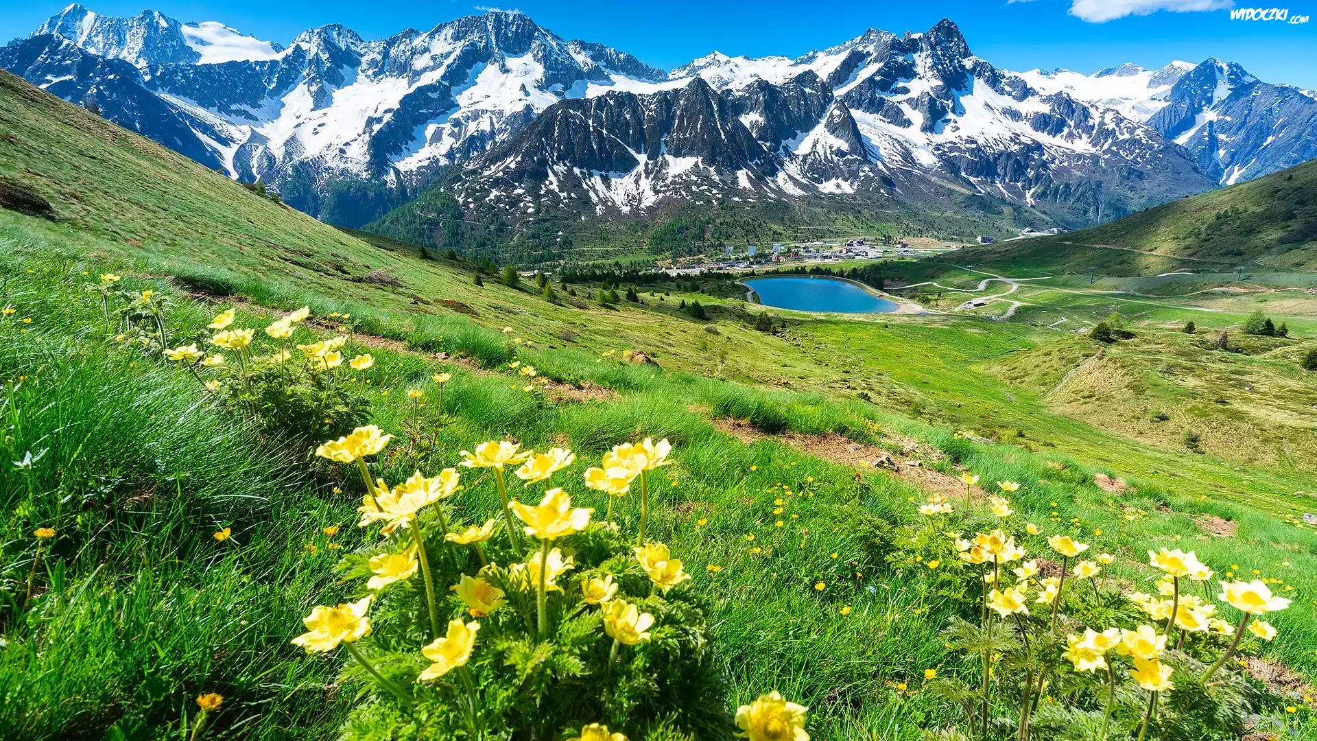 Zdjęcia, Góry, Ośnieżone, Szczyty, Jezioro, Drzewa, Kwiaty, Domy, Łąka