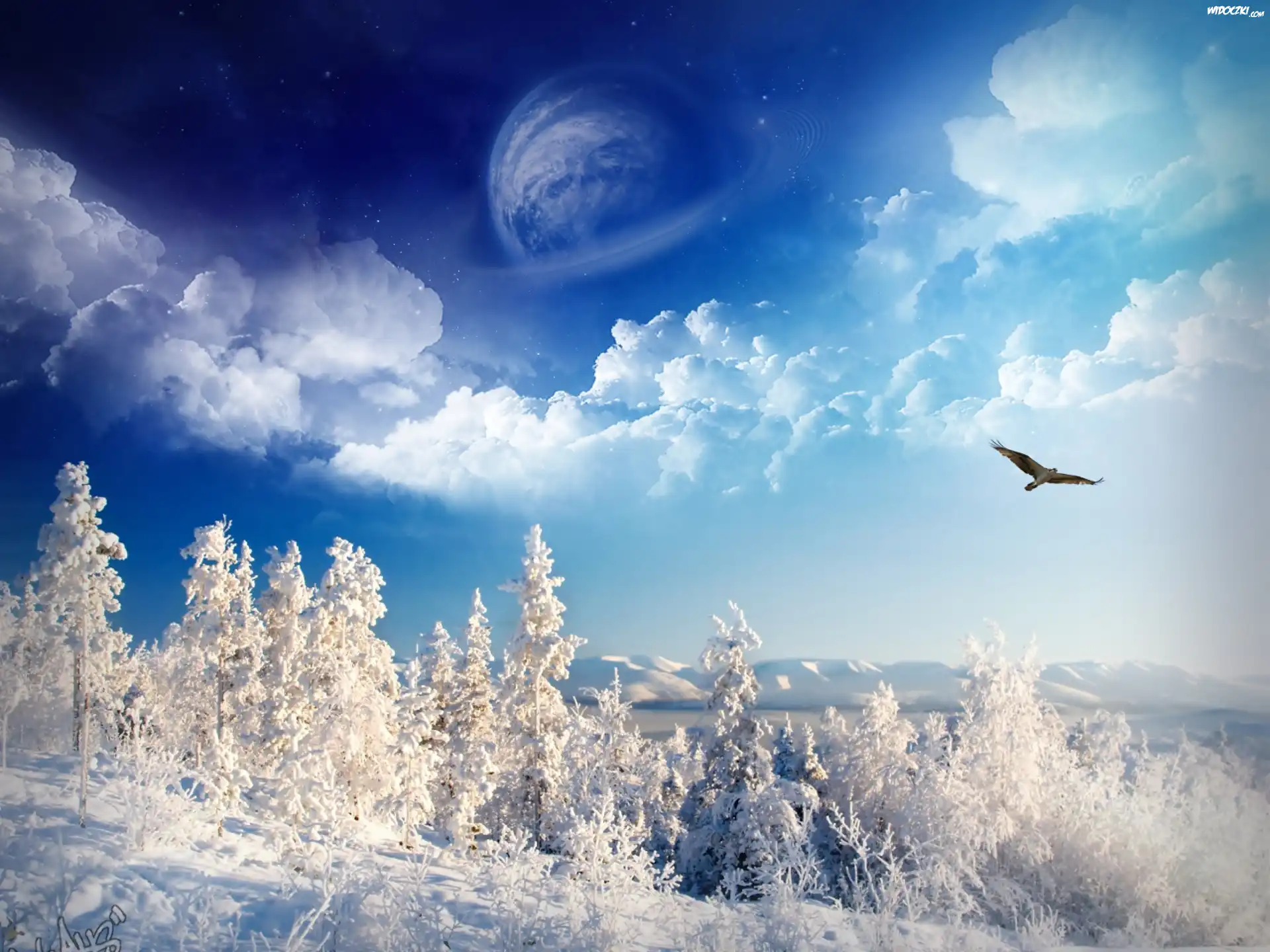 Zdjęcia, Ośnieżone, Drzewa, Góry, Chmury, Ptak