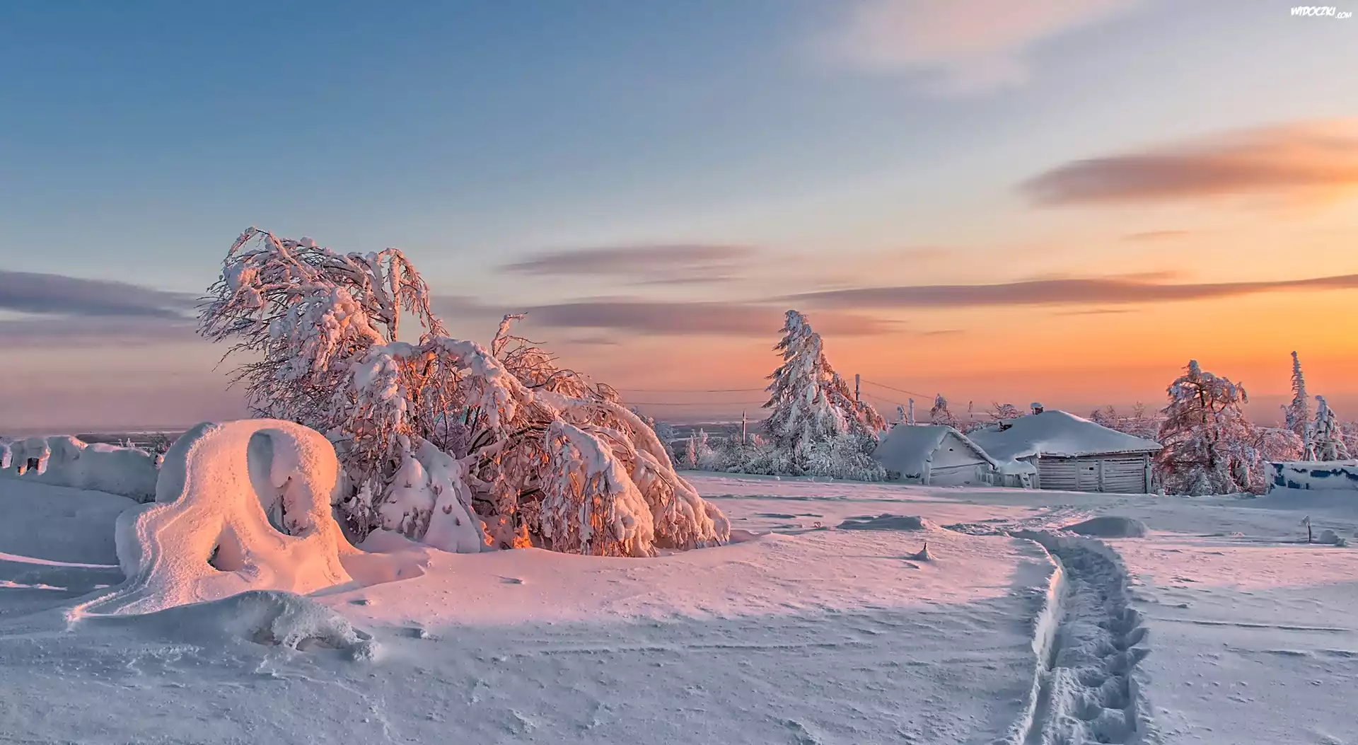 Zdjęcia, Ośnieżone, Drzewa, Domy, Ścieżka, Wieś