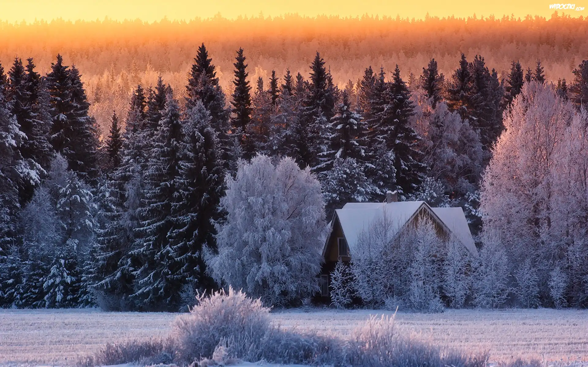 Zdjęcia, Domek, Ośnieżone, Drzewa