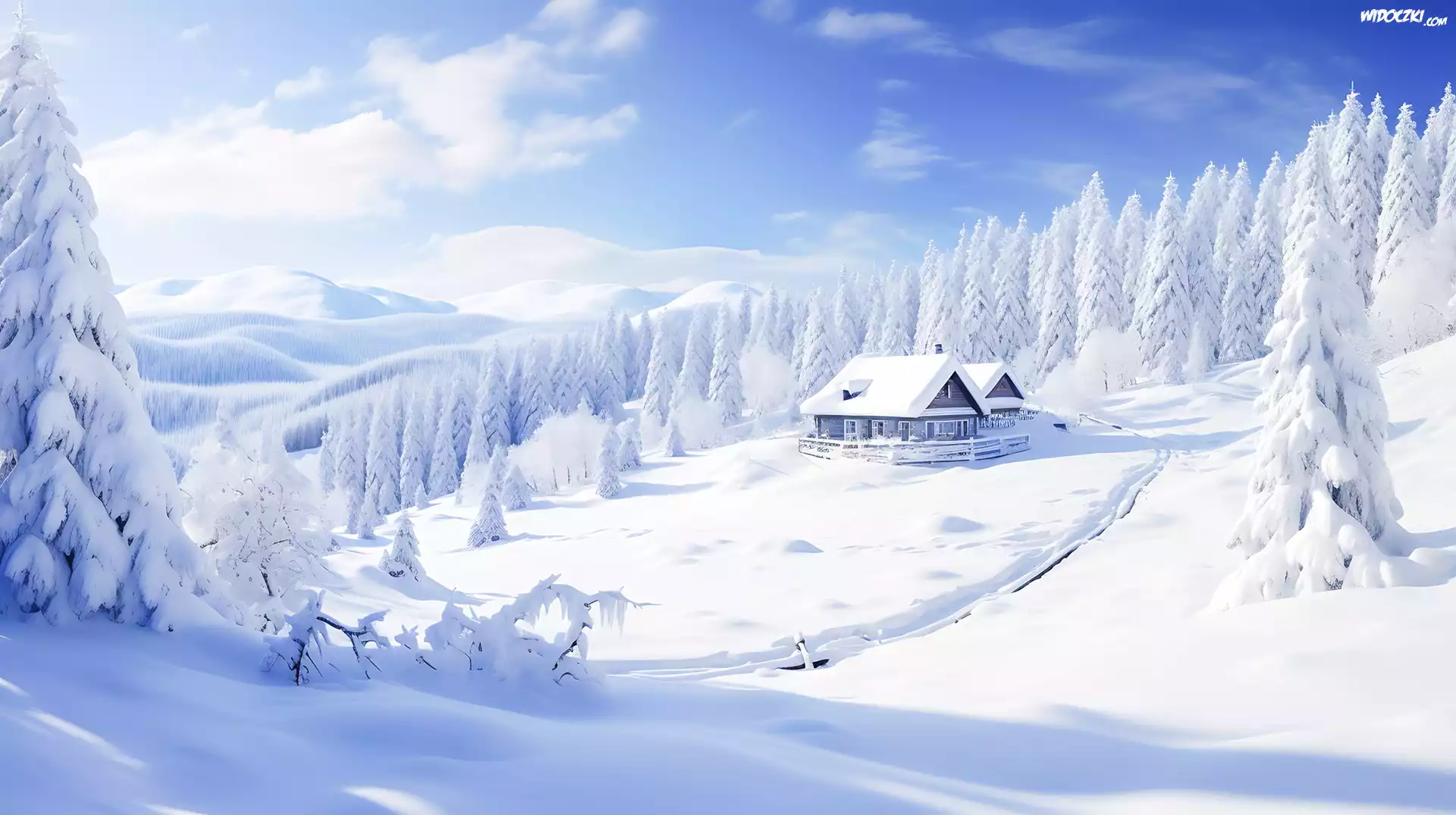 Zdjęcia, Zima, Ośnieżone, Drzewa, Domek, Grafika