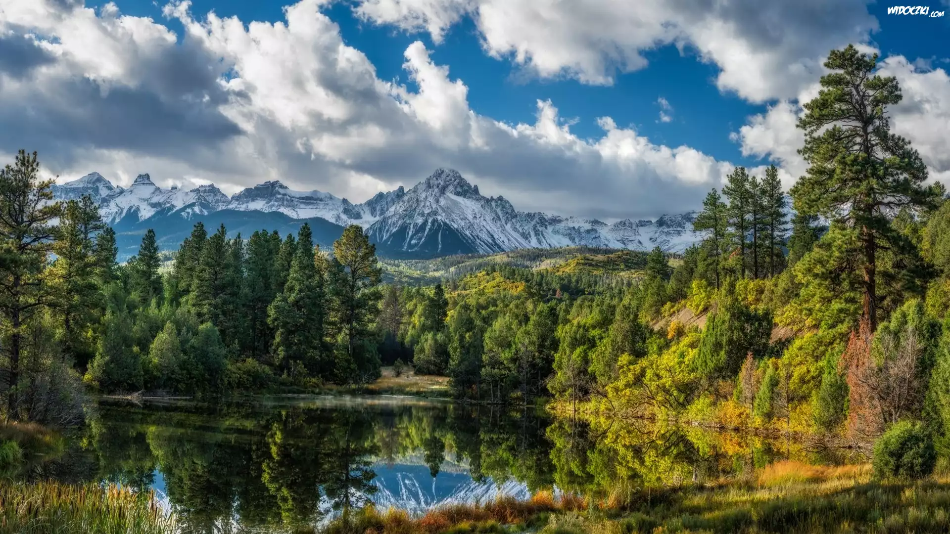 Ośnieżone, Góry, Jezioro, Las, Drzewa, Chmury