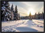 Zdjęcia, Zima, Świerki, Drzewa, Ośnieżone, Pole, Grafika AI