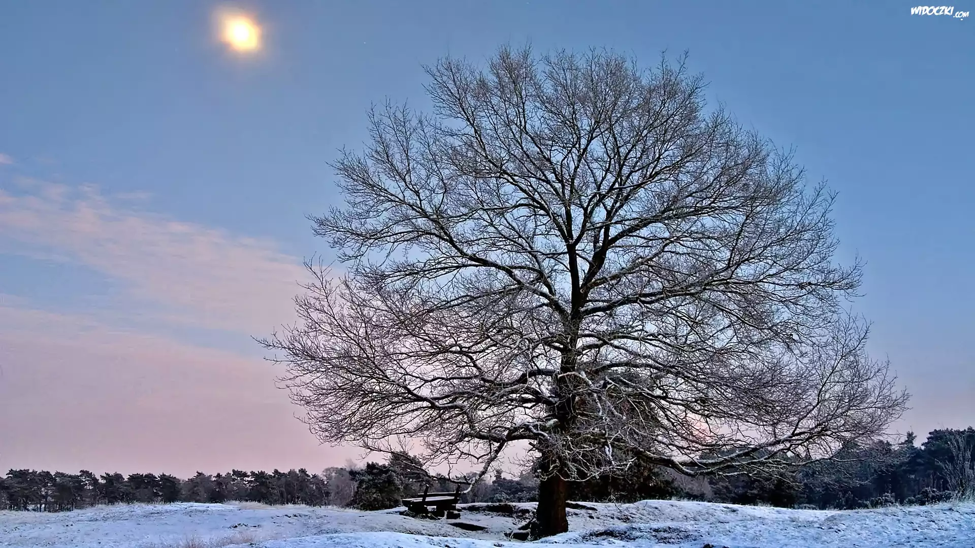 Ośnieżone, Pole, Samotne, Drzewo, Świt